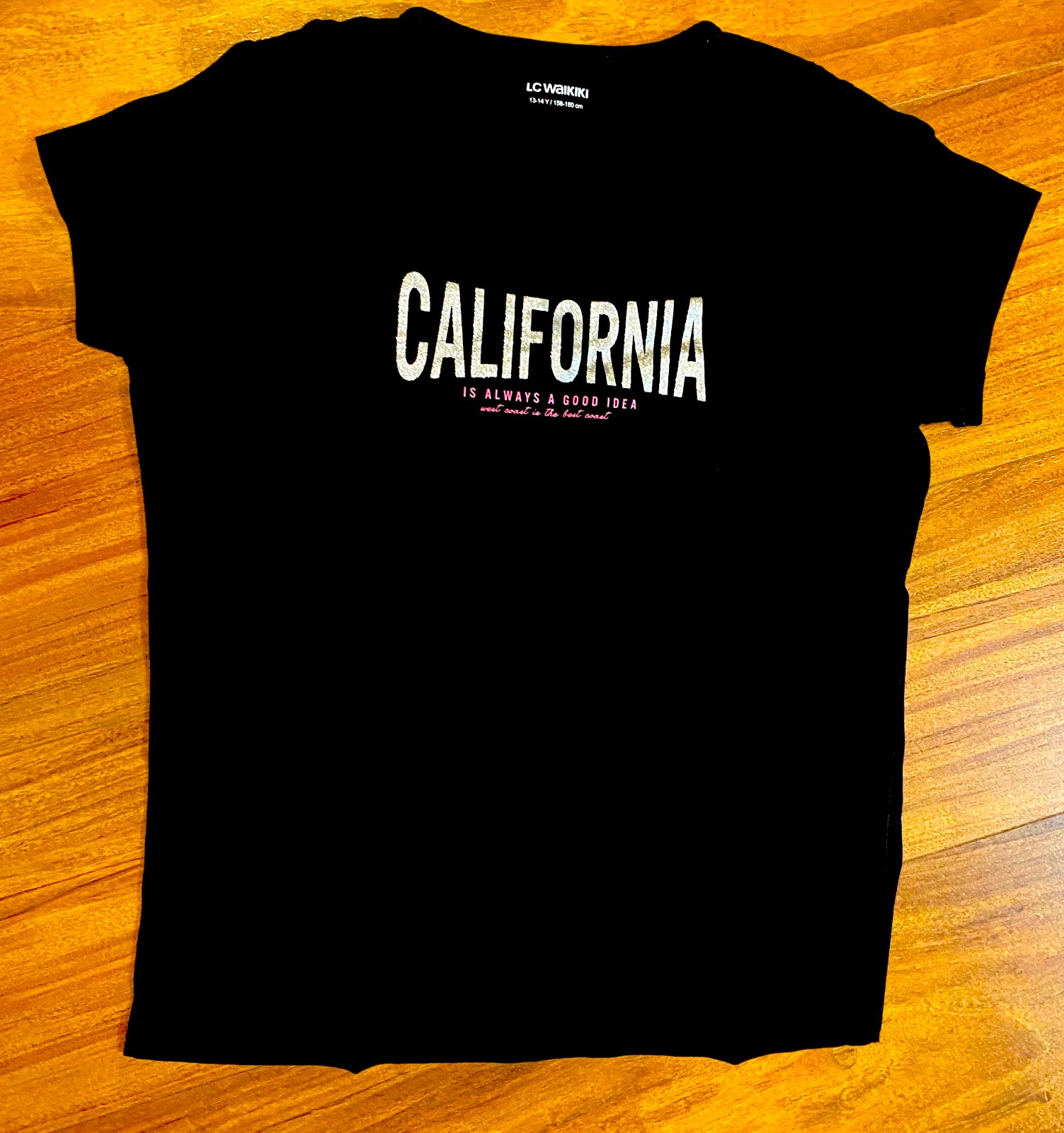 California tričko, veľ. na 13-14 rokov, 156-160 cm, so strieborným trblietavým nápisom