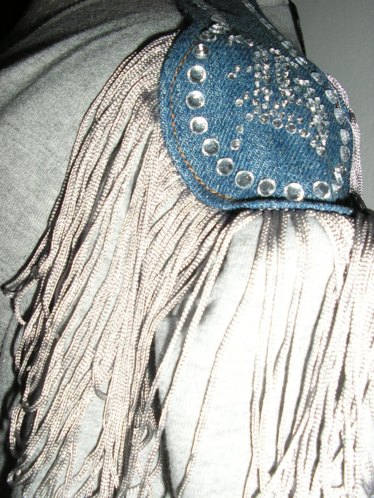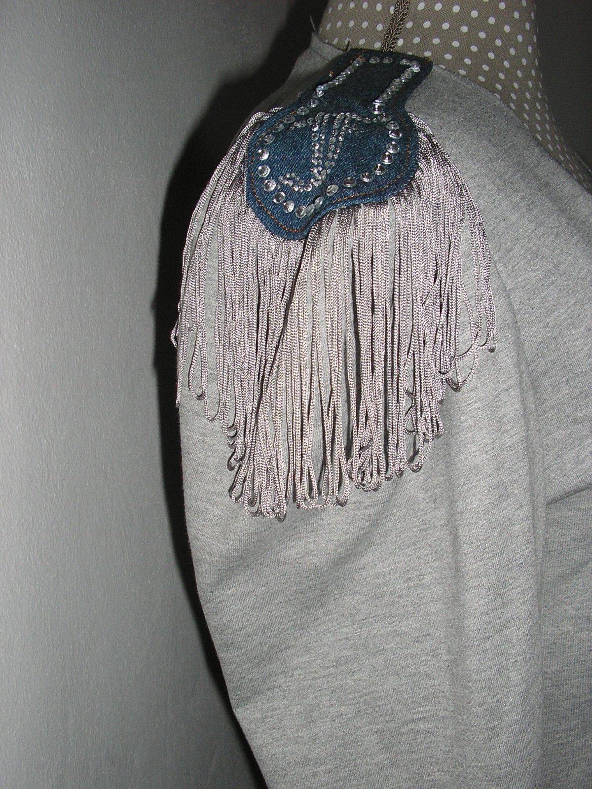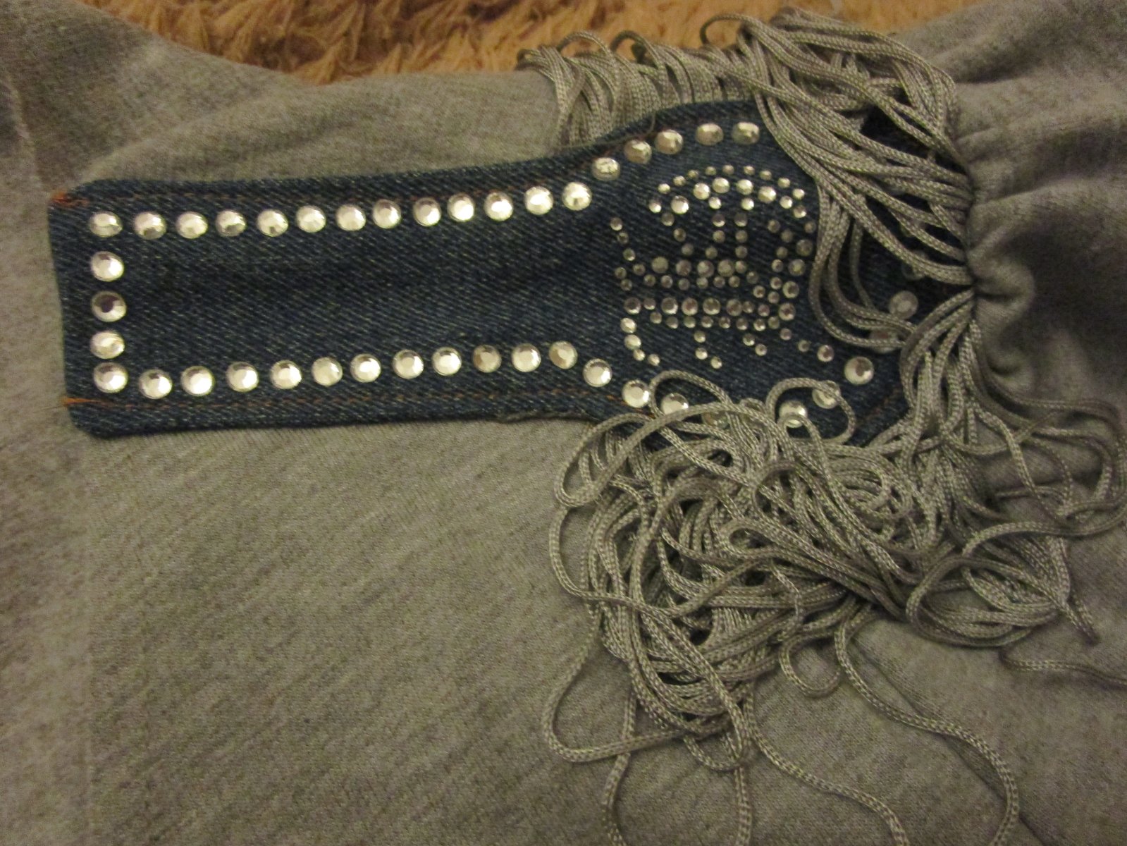 Zvláštnosťou je ozdoba na remene, strapce + kamienky, ako aj nižšie na rukáve – viď foto. Nevšedný, jedinečný kus Vášho oblečenia.