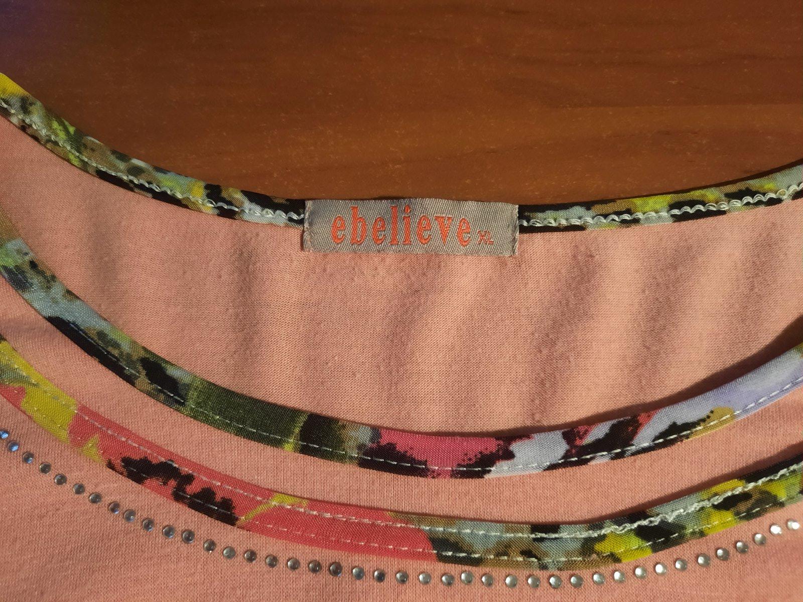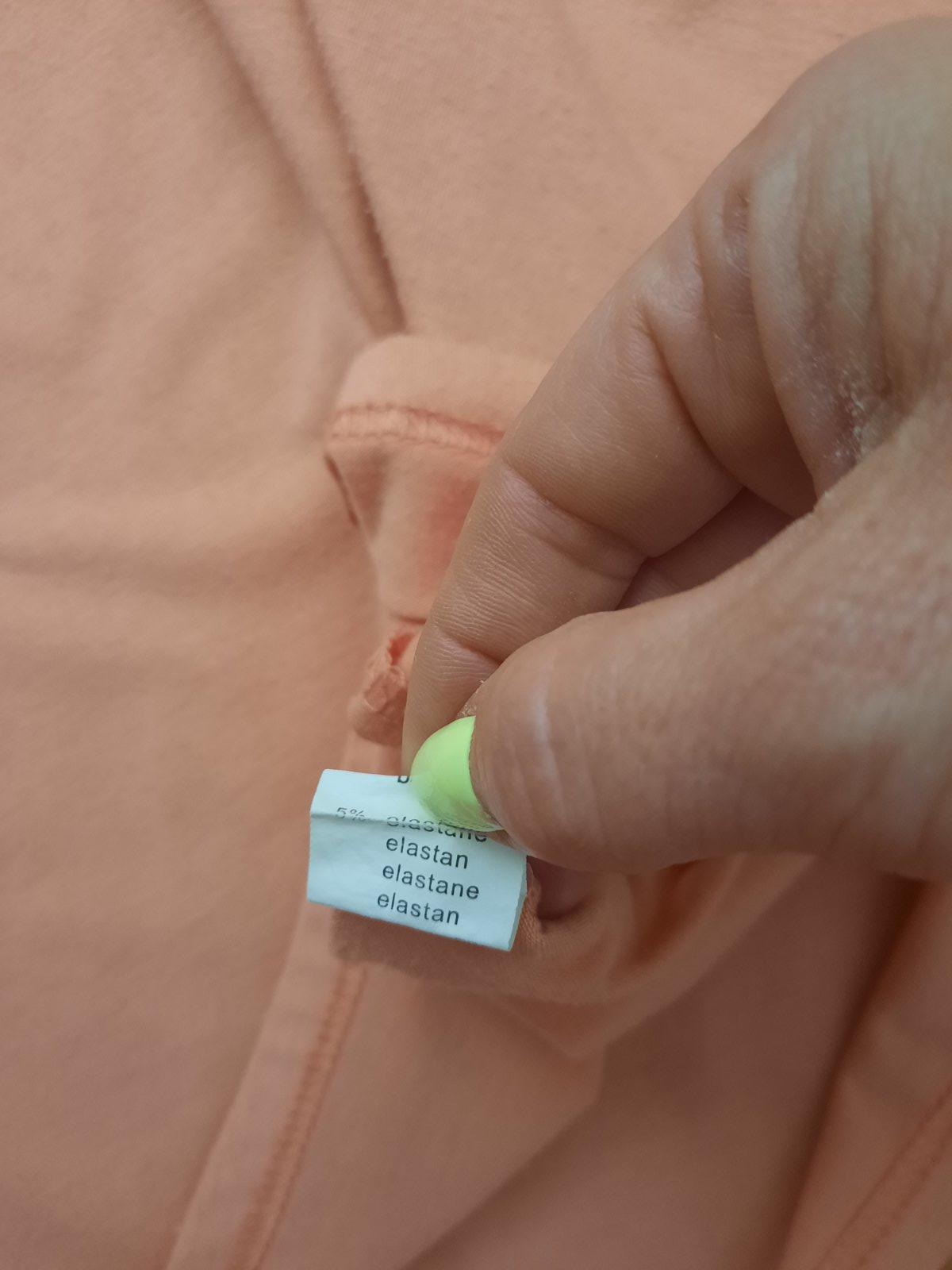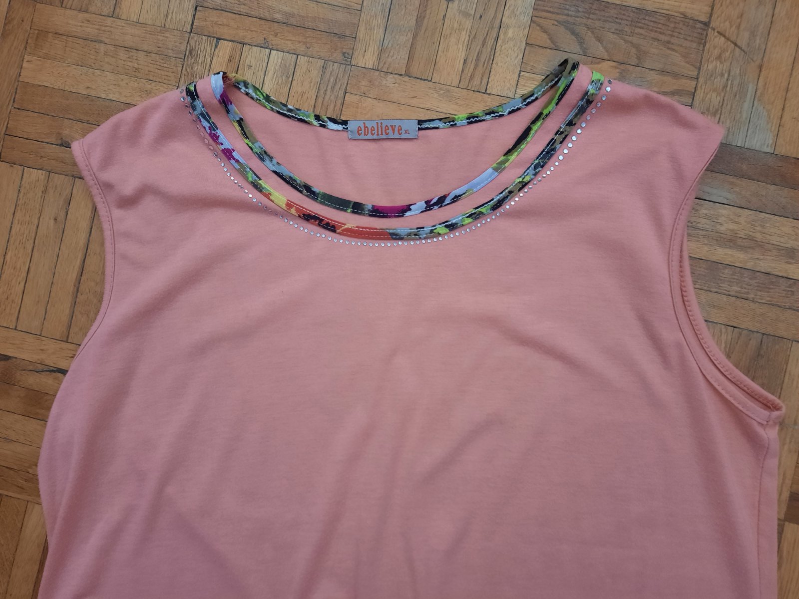 Pekné elastické tričko, okolo krku drobné kamienky a farebné lemovanie. Farba je marhuľovo-lososová.