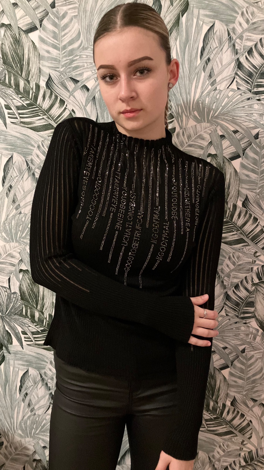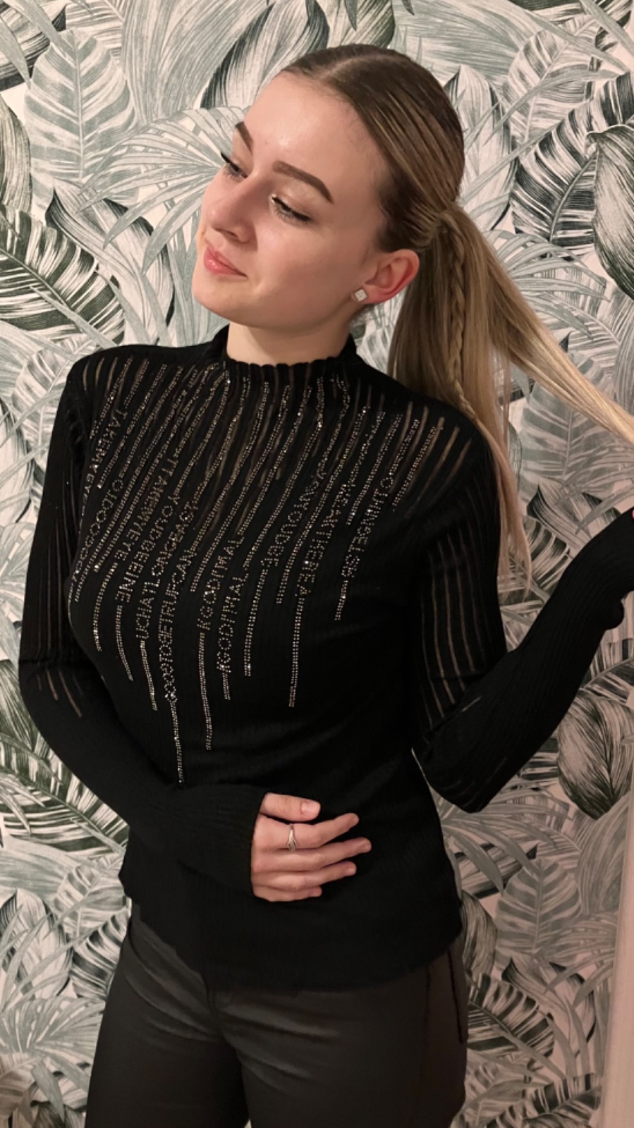 Elegantné vrúbkované tričko je skvelou voľbou pre mnohé štýly. Tričko je so stojačikom, má ozdobné kamienky a aplikáciu z tylovej vsadky. Elastický materiál.