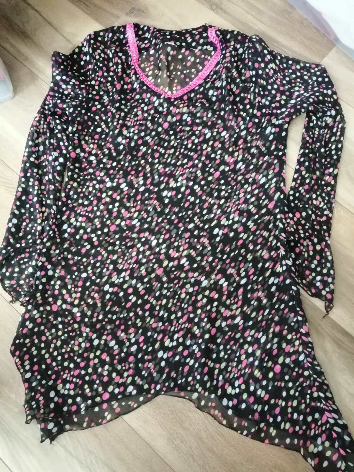 asymetrický top čiernej farby, šifónové rukávy, veľkosť L.