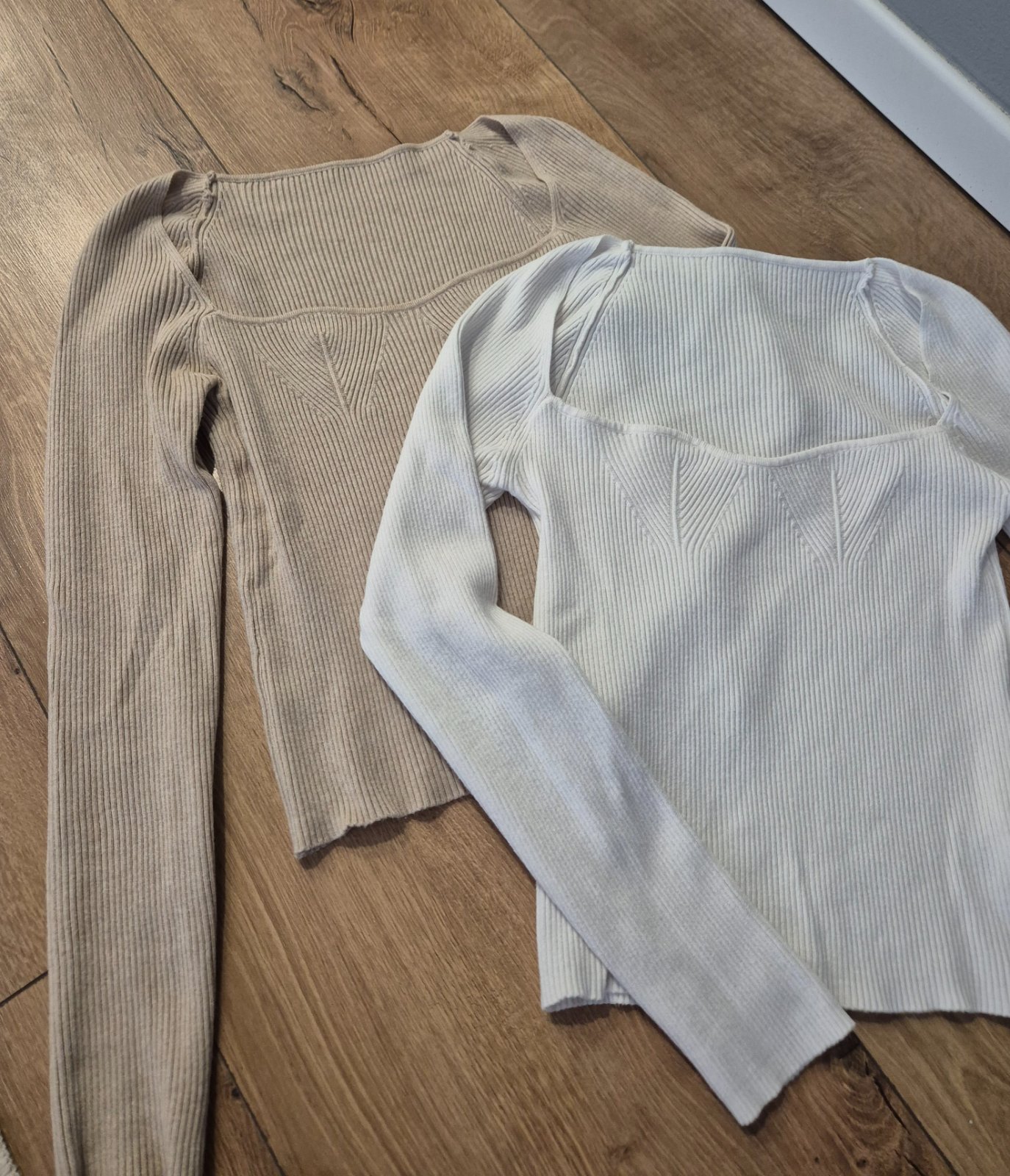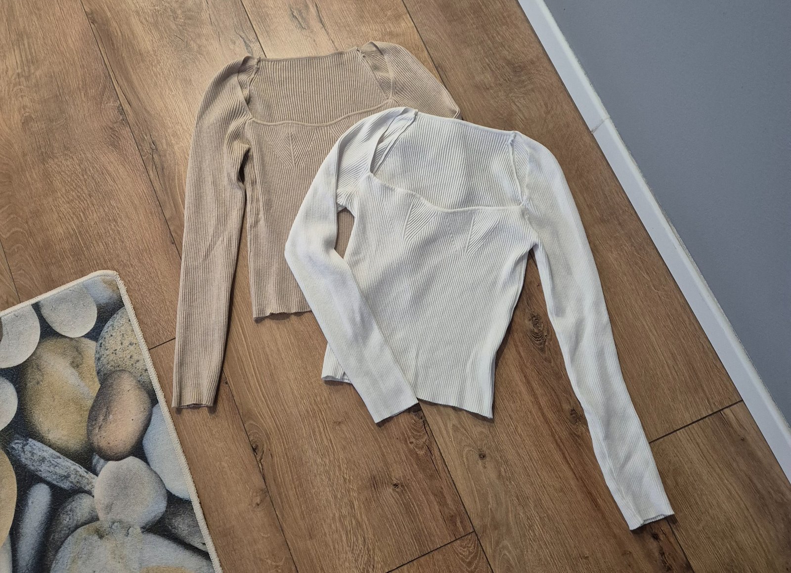 Predám obidva svetre za 8eur. Dá sa dohodnúť aj zvlášť. Je to vrubkovaný materiál. Sú elastické. Celková dĺžka 50cm. Rukáv 65cm. Cez prsia 2×35cm.