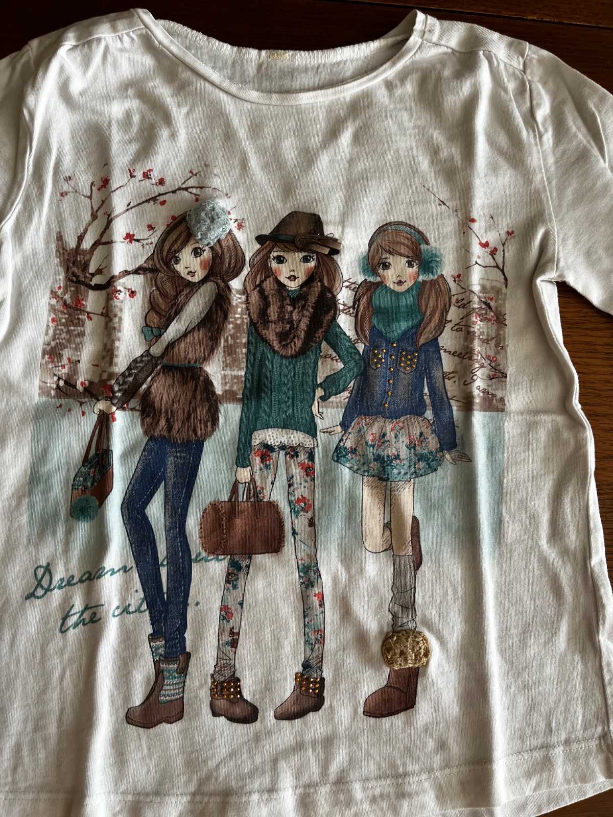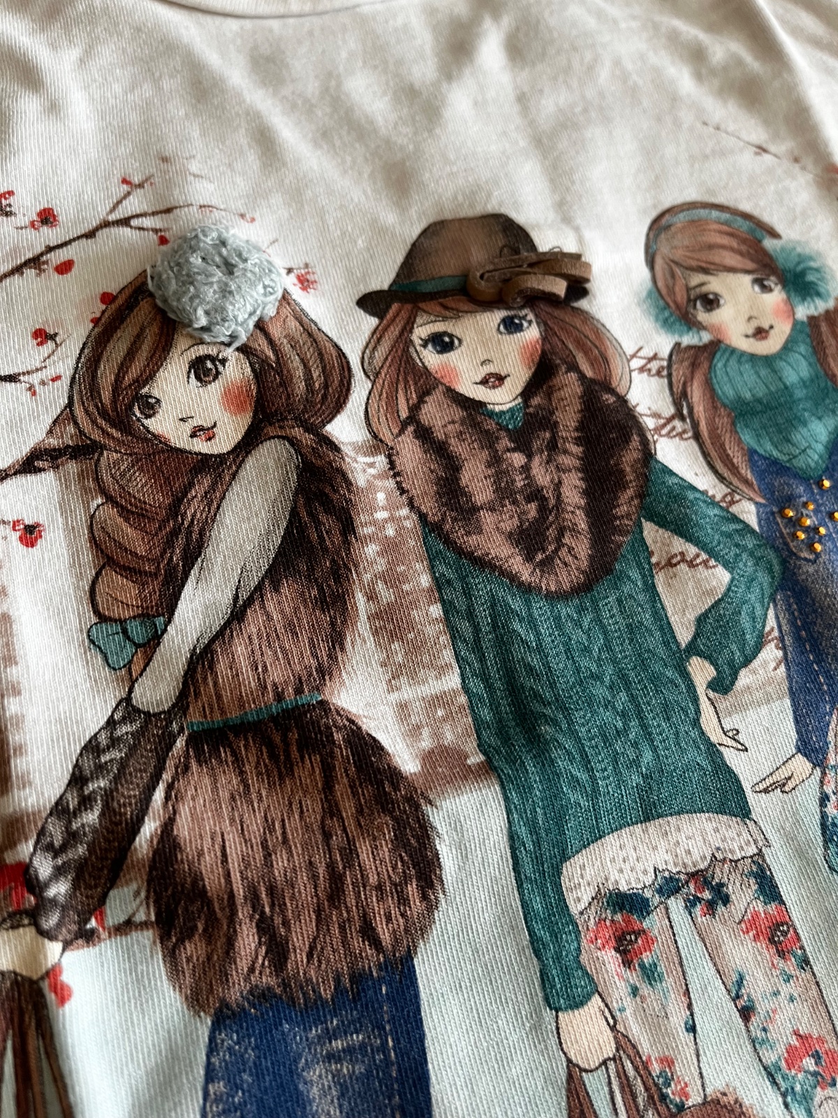 Potlač dievčat je zdobená kamienkami, plieškami, mašličkou a 3D aplikáciami pleteninových brmbolčekov a koženej ozdoby na čiapke jednotlivých dievčat. Tričko je z príjemného bavlneného materiálu.