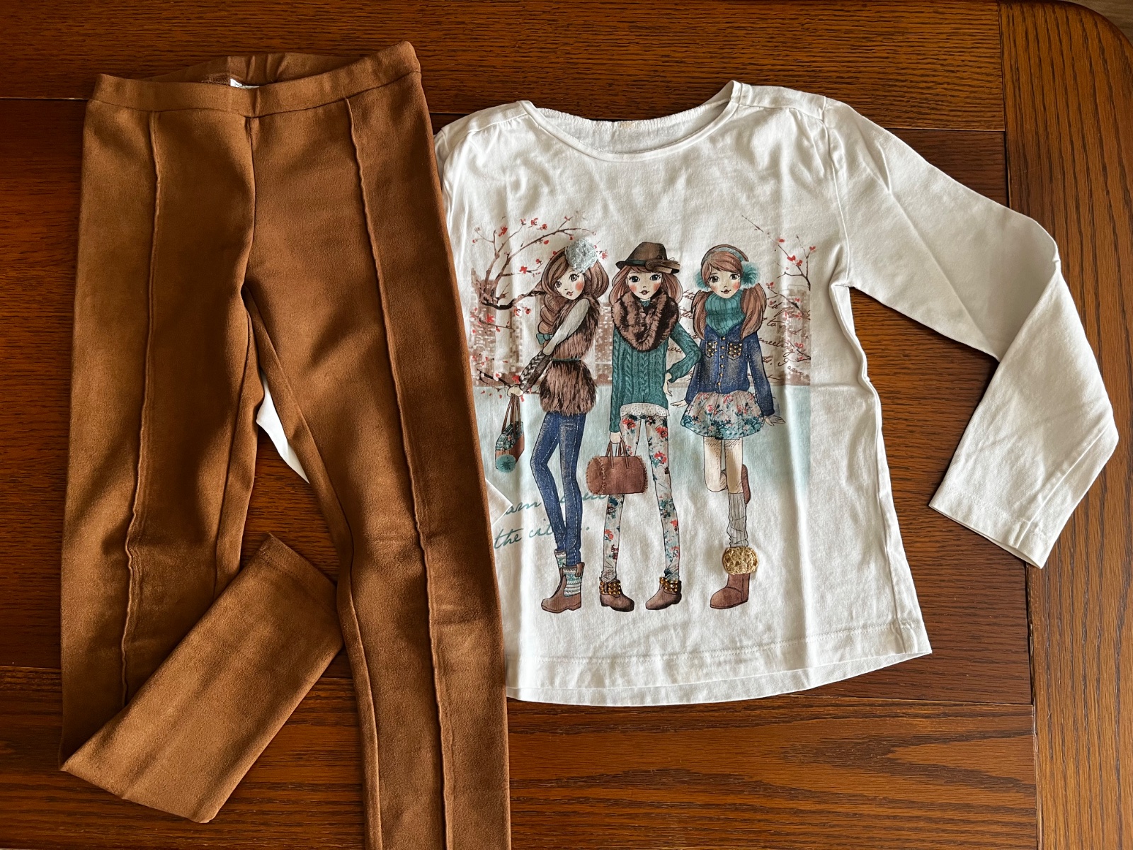 K tričku sa perfektne hodia hrubšie legínky Mayoral, ktoré máme tiež v bazáriku (viď posledná detail foto).