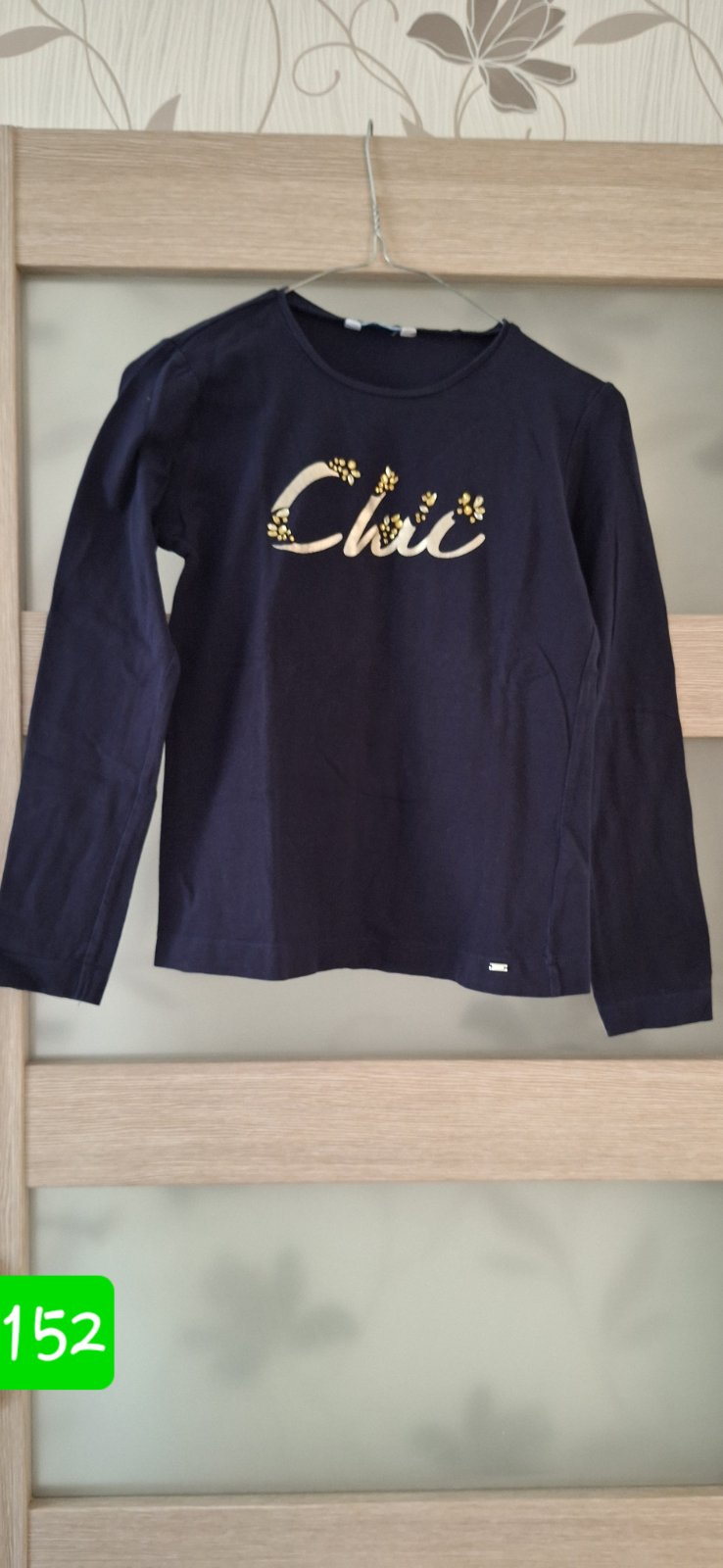 Predám dievčenské tričko s dl.rukávom, farba tmavo modrá s peknou potlačou, strihovo je kratšie, na boku rozparky.bez poškodenia, miery: dĺžka 48cm., rukáv od krku 57cm., od pleca 48cm.,veľ.152/158...