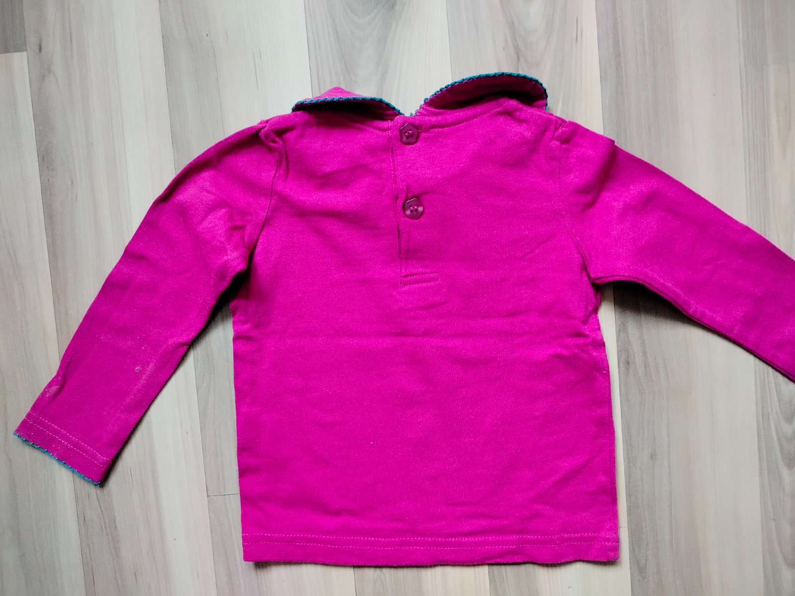 Má pekný modrý lem okolo goliera a koncov rukávov, 2 gombíky vpredu pre ľahšie obliekanie. Materiál príjemný, mäkký, kvalitná bavlna, dobre sa nosí.Žiadne diery, fľaky, žmolky ani vyťahanie, stav ako nové, nosené minimálne.Veľkosť č. 80 (12-18 mesiacov)