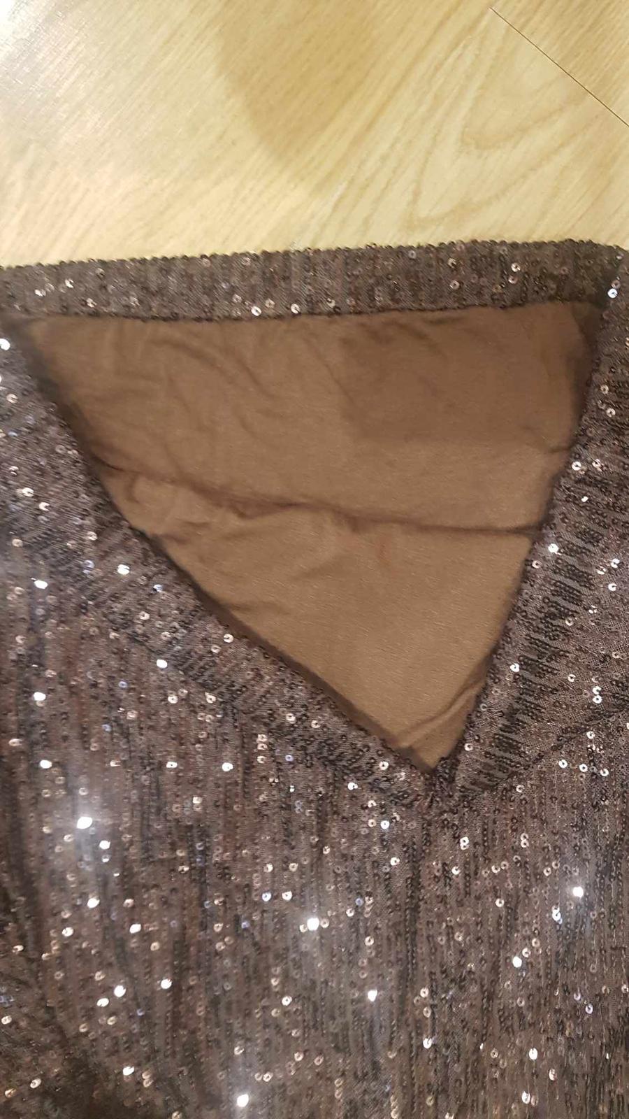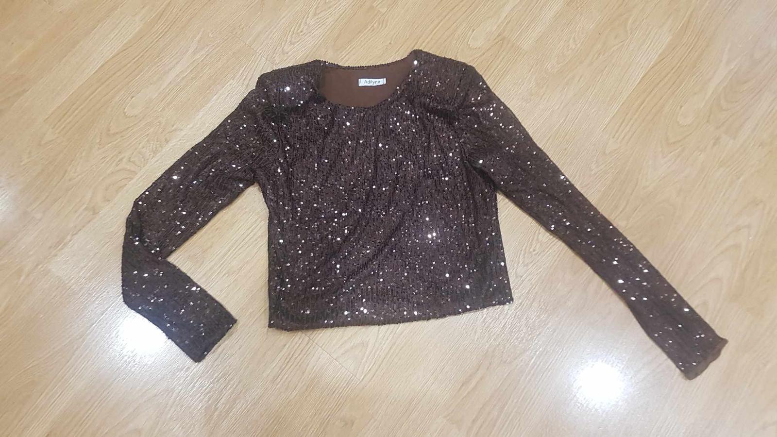 flitríkové tričko je elastické, podšité bavlnou, takže flitríky nie sú v kontakte s pokožkou. Podšité je aj v rukávoch. Veľmi dobrý stav.
