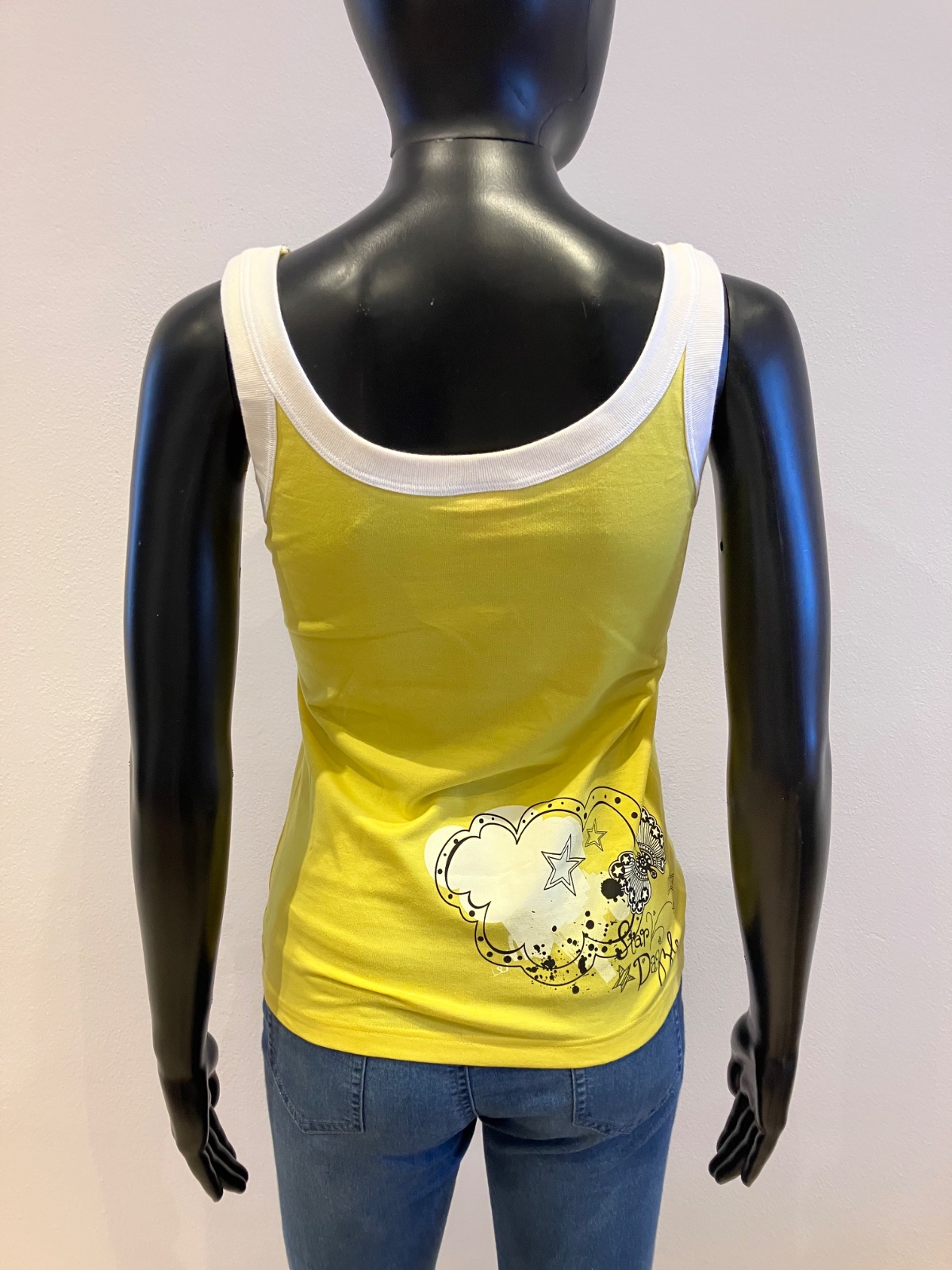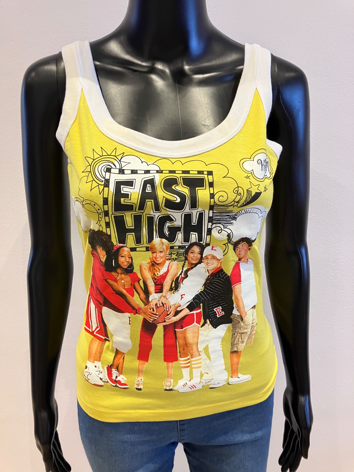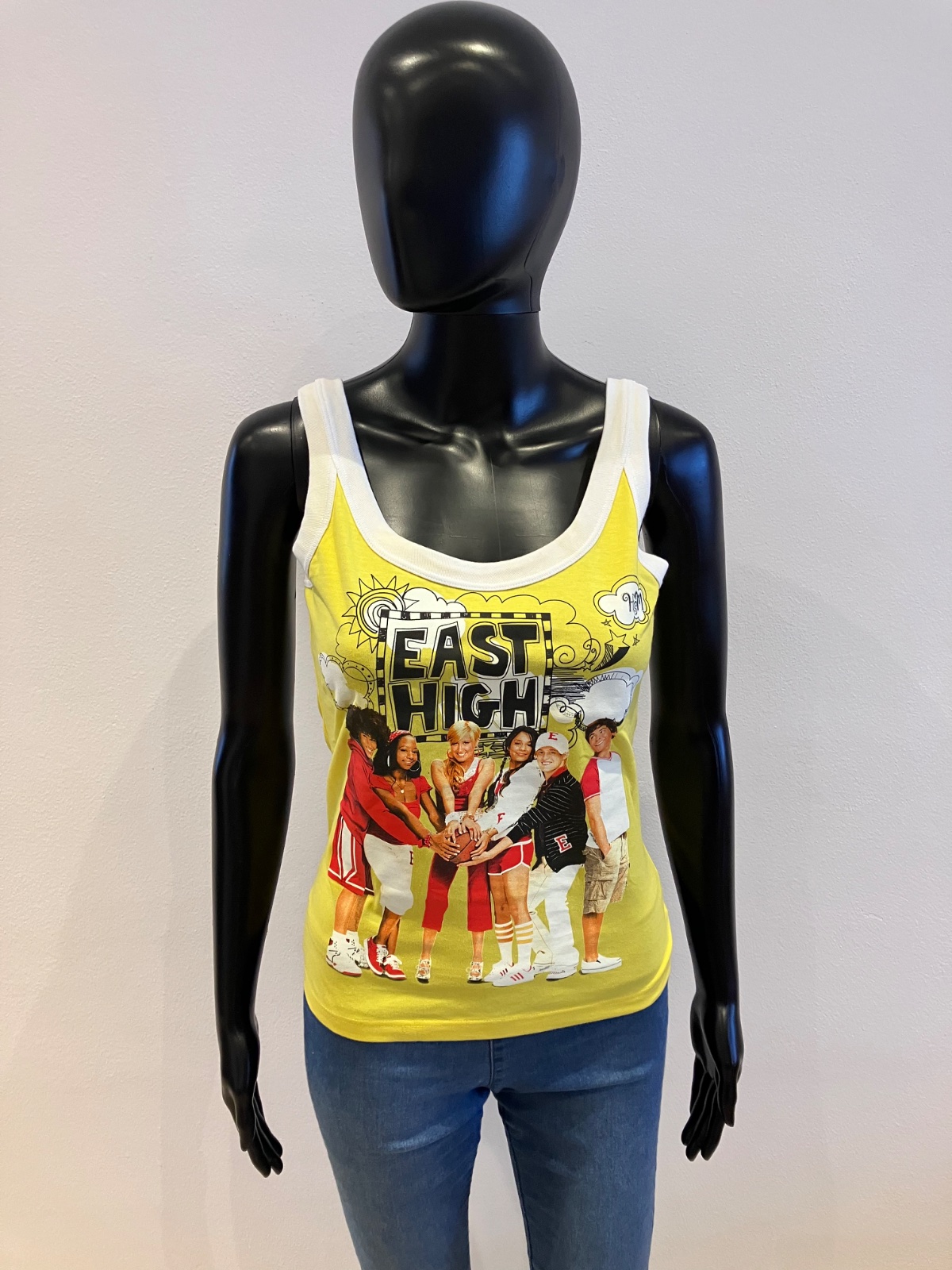 Žlté tričko so širokými ramienkami dievčenské, dámske, jemne elastické, s potlačou High School Music, materiál 100% bavlna.
