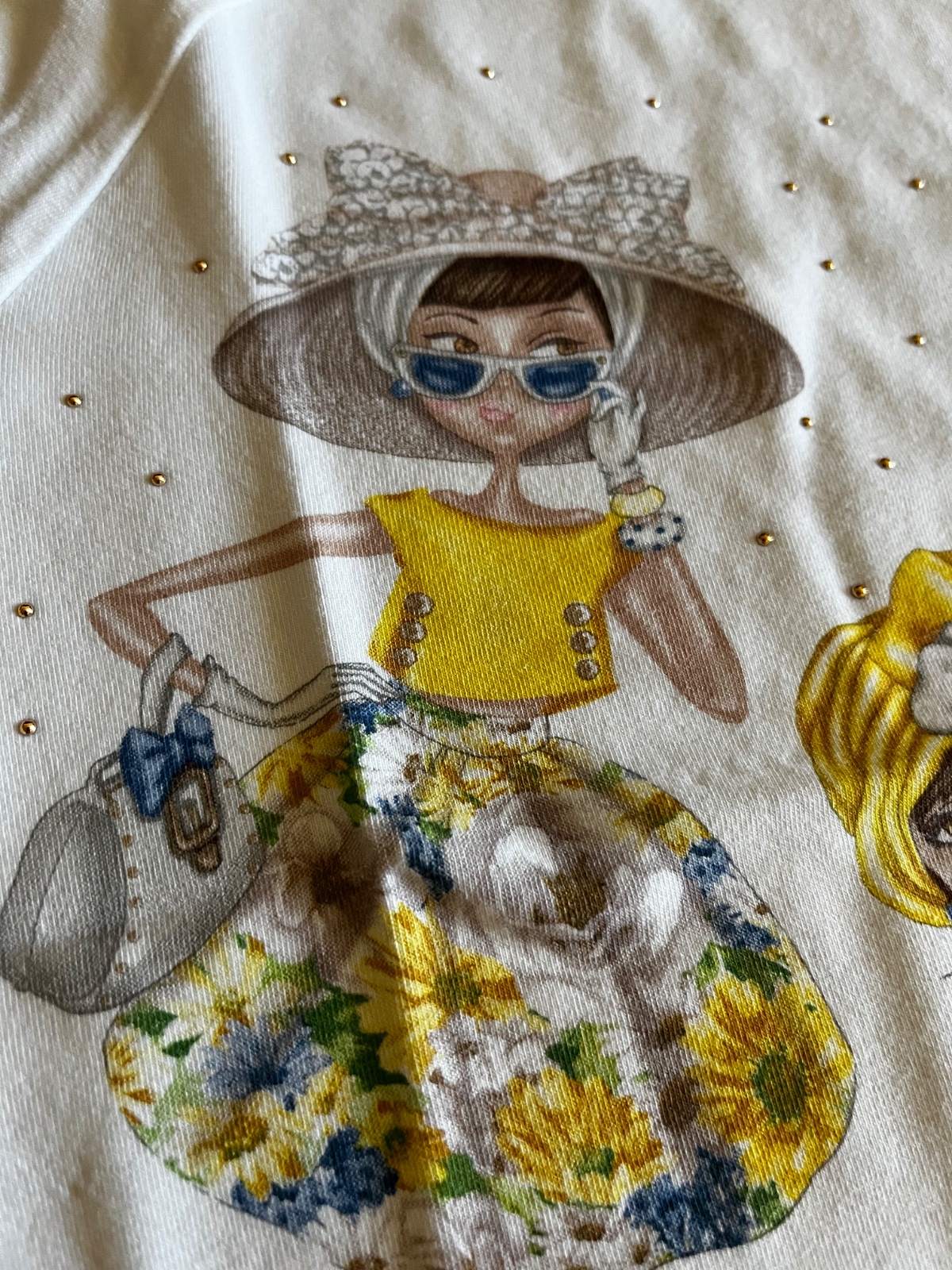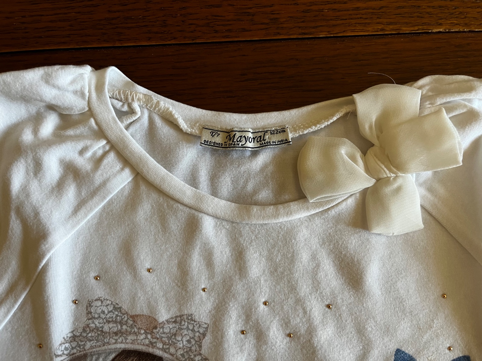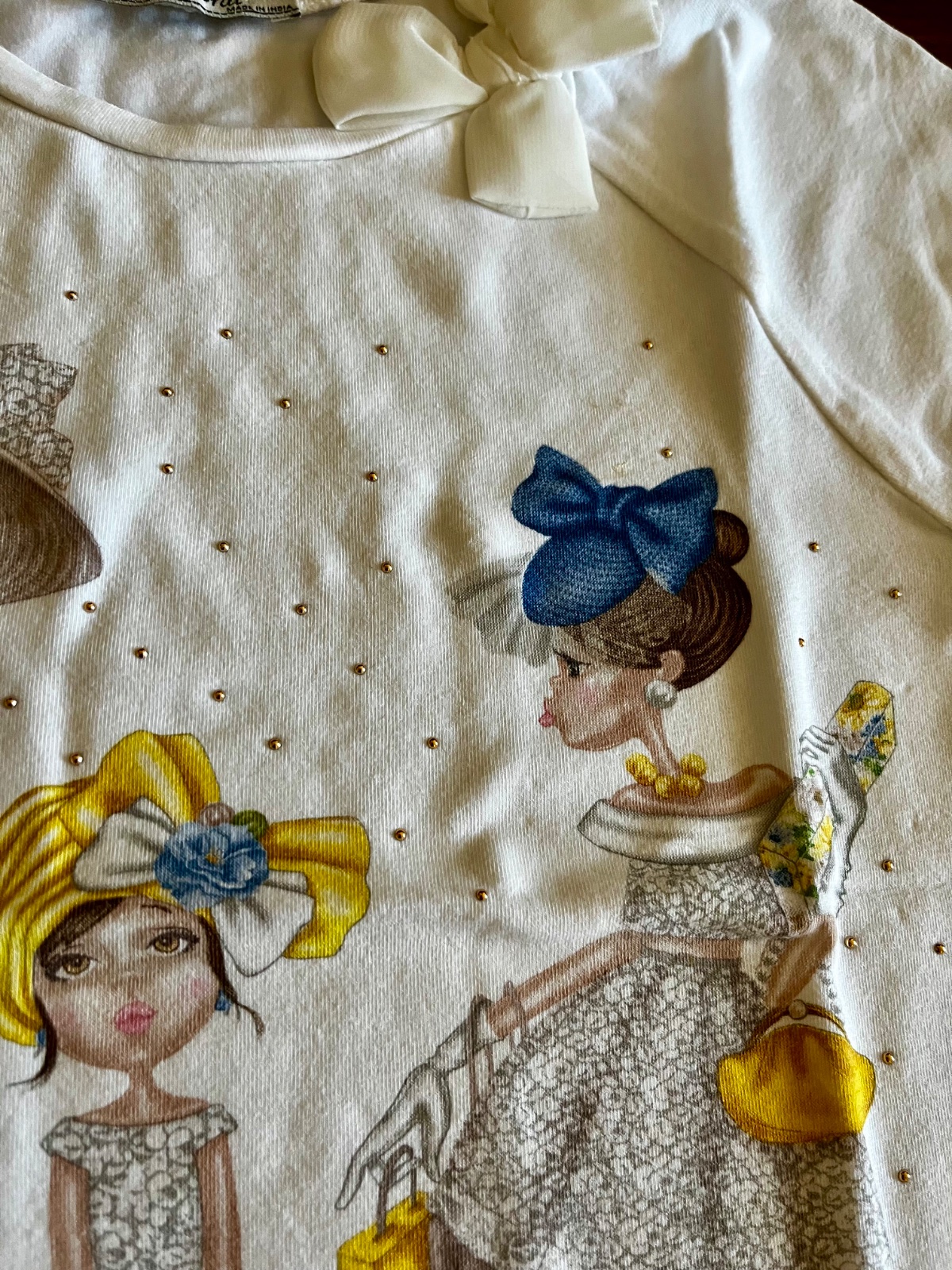 Vpredu je krásny obrázok dievčat, lesklé strieborné kamienky, pri výstrihu 3D aplikácia mušelínovej mašličky.