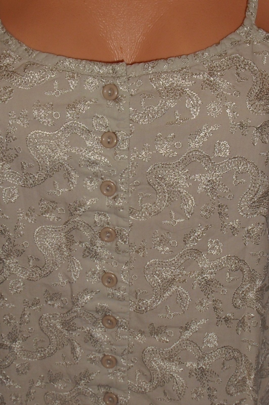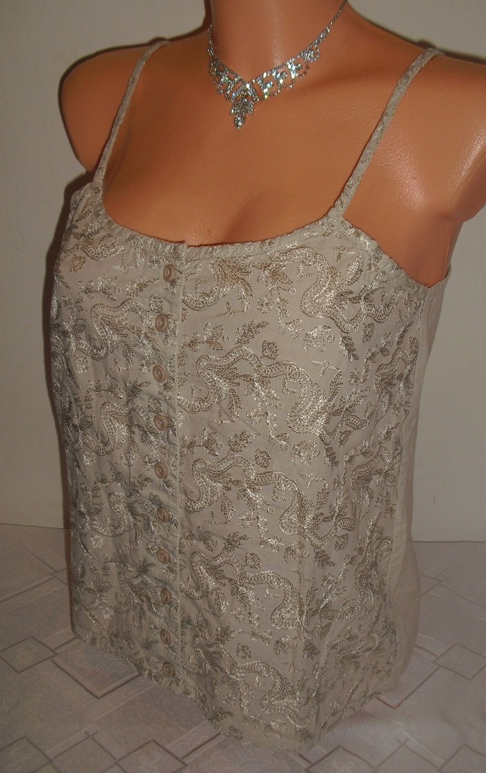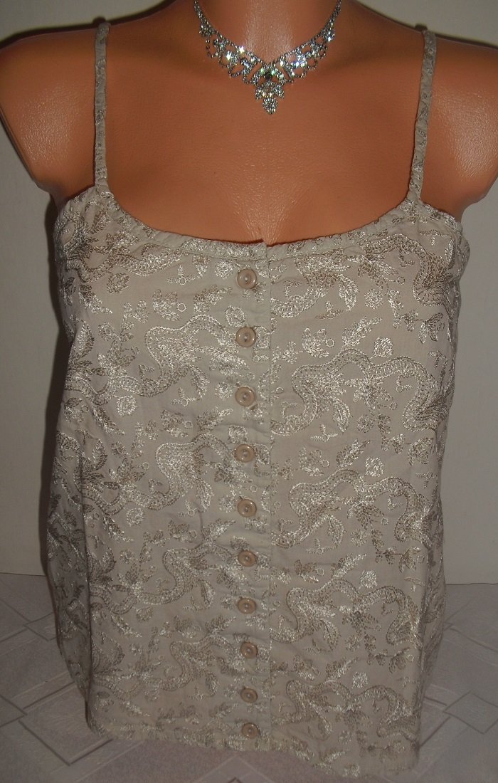 predam nadherny top, krojovy , vysivany, zapinanie na gombicky na predu, vyborny stav, velkost ide na mensie l. sirka 41,6 cm x 2, dlzka s ramienkami 53 cm.