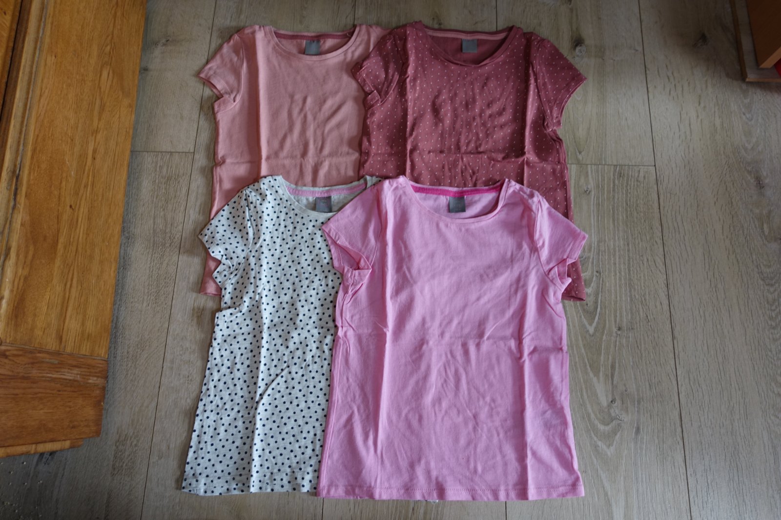Predám 4 krásne jednofarebné tričenká vo veľkosti 134/140. Kupované nové. Boli iba opraté a odskúšané. Už žiaľ boli dcérke krátke. Mali sme toho veľmi veľa, nestíhali sme všetko nosiť. Top stav. Ako nenosené. Celková dĺžka staroružového tričenka od pliecka po spodok je 47,5 cm, sýtoružového najtmavšieho tričenka s bodkami je 46 cm, svetlošedého s bodkami je 46 cm a cukríkovo ružového je 46,5 cm. Predám iba spolu, takto boli kúpené v jednom balení. (G)