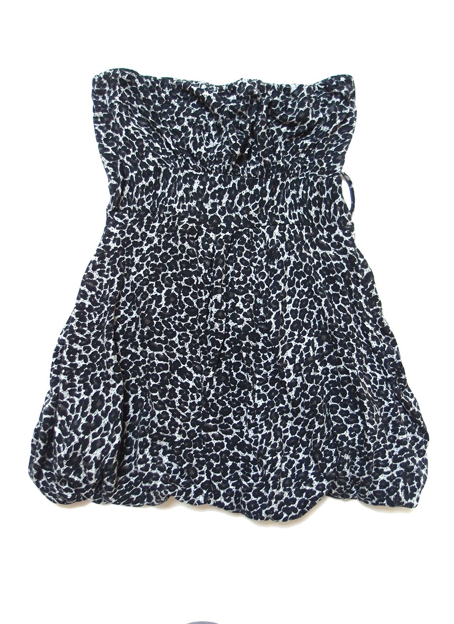 bez ramienok, na prsiach podšitý a nariasený, spodok tiež podšitý + jemne nariasený do balónového strihu, mäkučký, pohodlný, pod prsiami pútka na opasok, uv. veľ. S, dl. 51cm, veľmi dobrý stav bez poškodení.