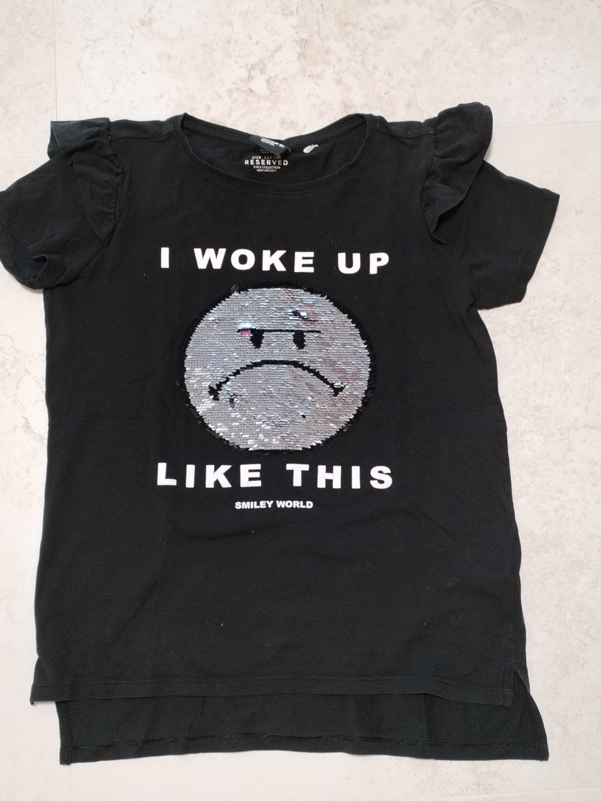 Dievčenské tričko Reserved veľ. 152, čierne s obojstrannými flitrami - nie je vypraté, zle mi odfotilo, motýlie rukávy, dĺžka vpredu 52 cm, vzadu 58 cm, vynikajúci stav