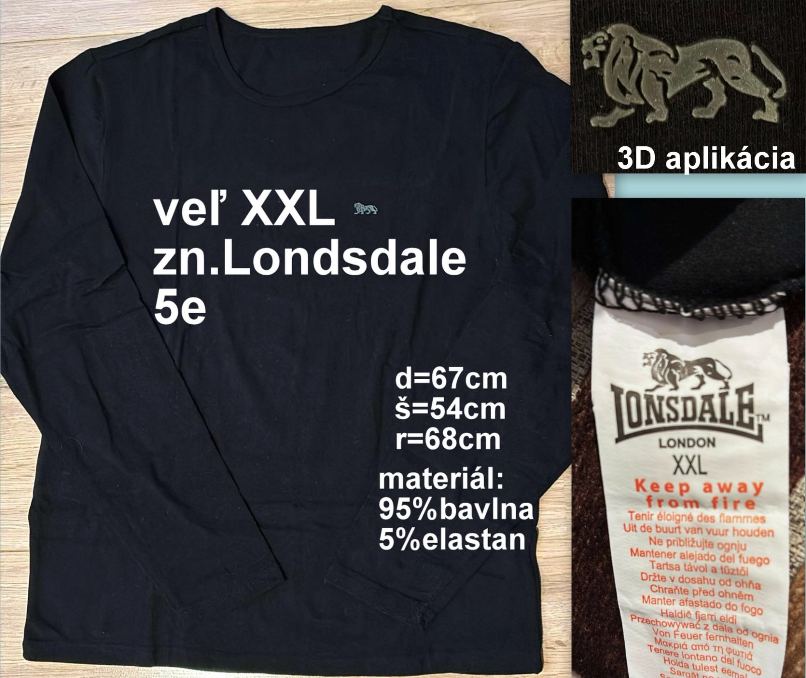 Pánske tričko s dlhým rukávom veĺ.XXL, zn.Lonsdale, d=67cm, š=54cm, r=68cm, materiál 95% bavlna, 5% elastan, raz oblečené