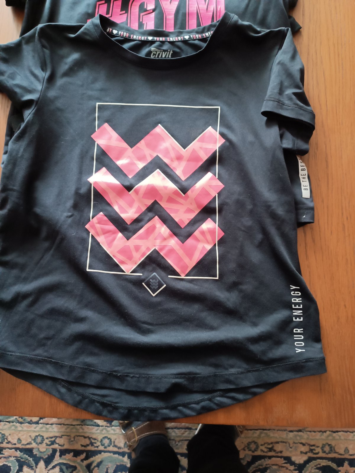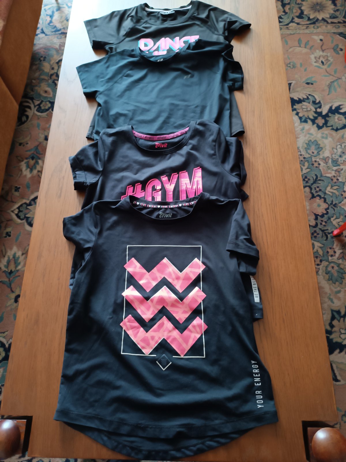 Dve tričká Crivit, jedno Destination, jedno, čisto čierne, kupované v Sportisimo.