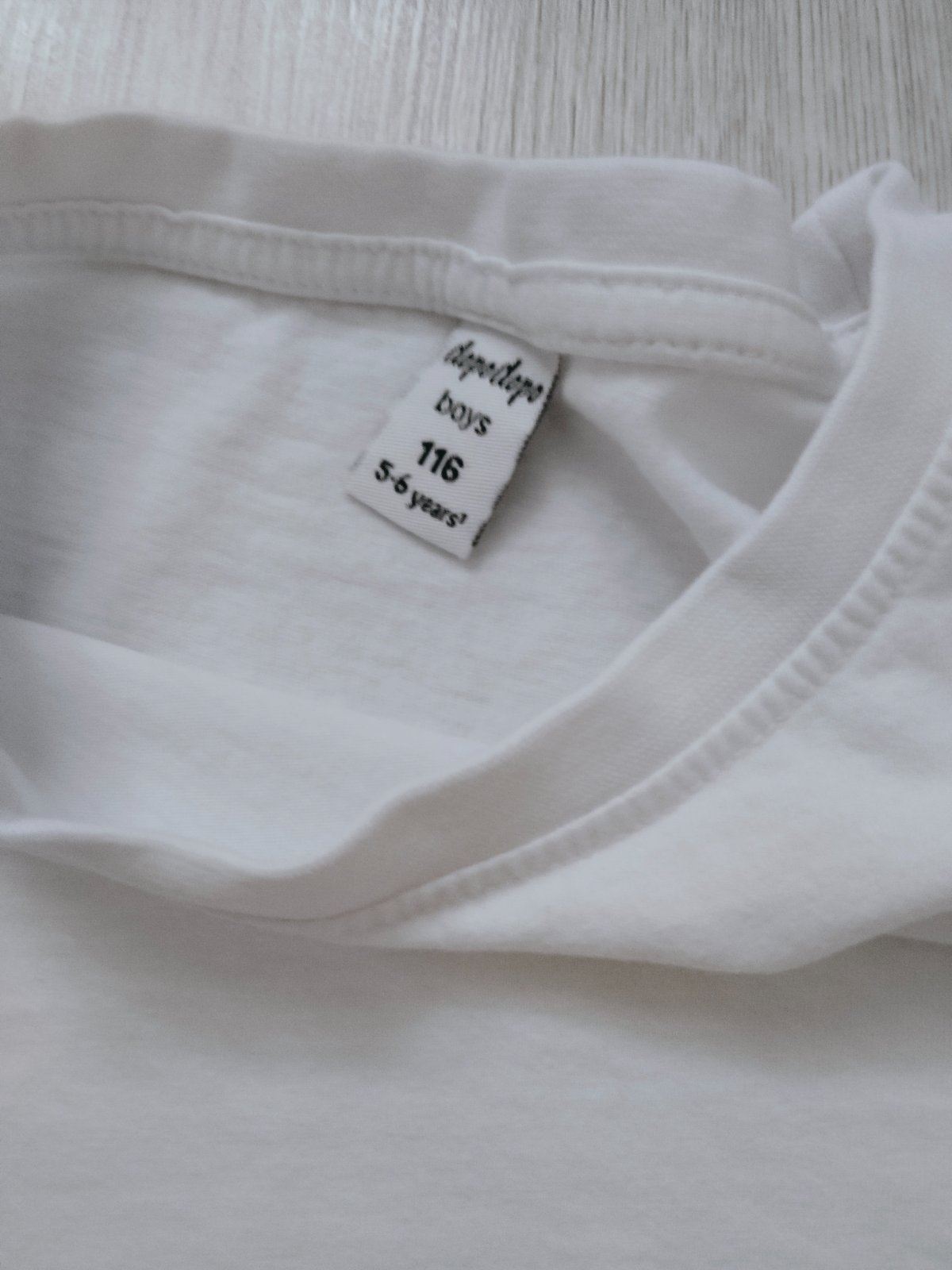 Biele tričko s oranžovým nápisom, veľkosť 116, značka Dopodopo. Rozmery sú na fotkách, 100% bavlna. Párkrát oblečené, nepoškodené. Máme viacero detských vecí, môžete si zostaviť vlastný balíček. Pr...