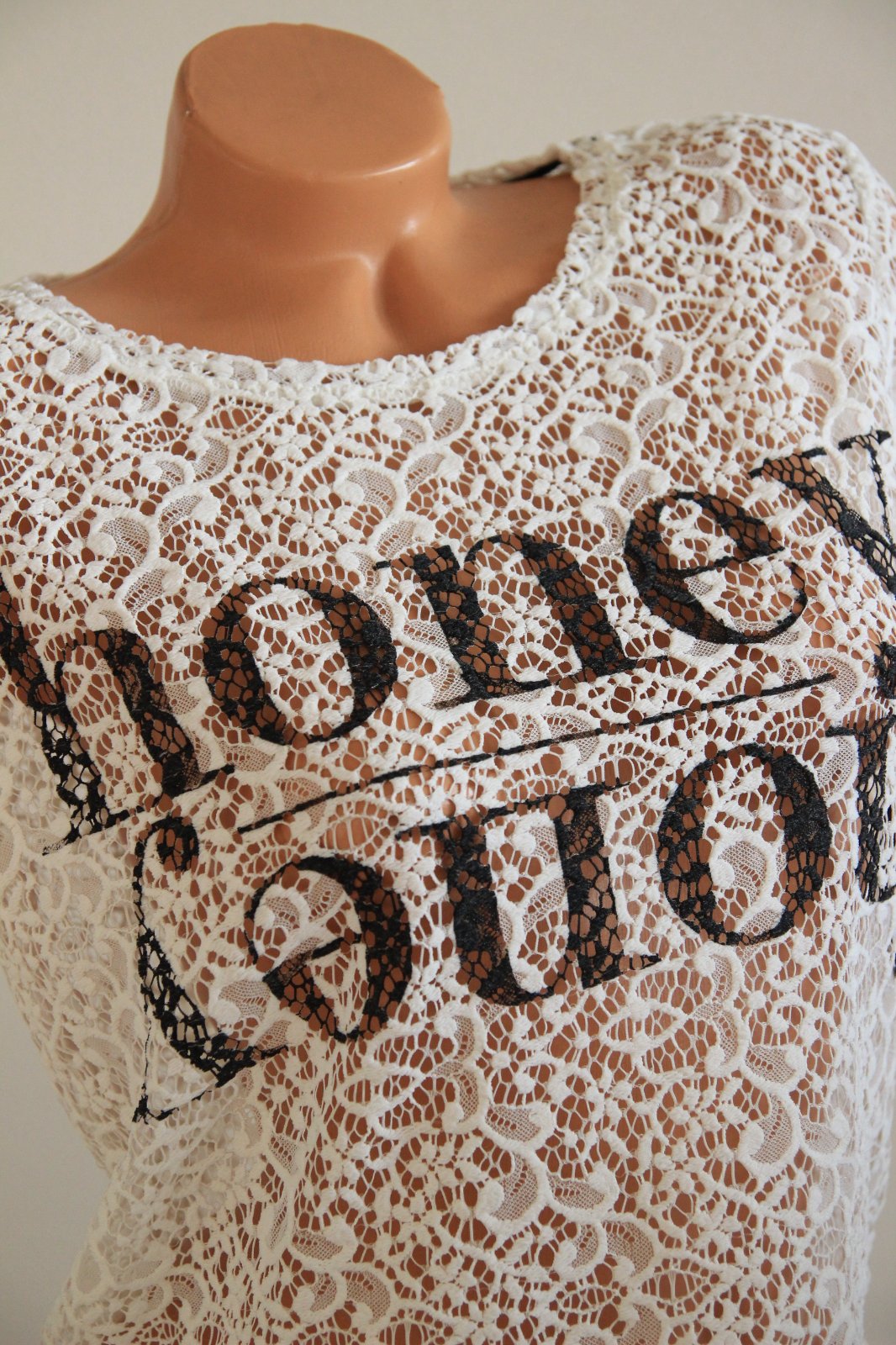 Biely čipkovaný top s čiernym nápisom Honey, veľkosť M. Top stav.