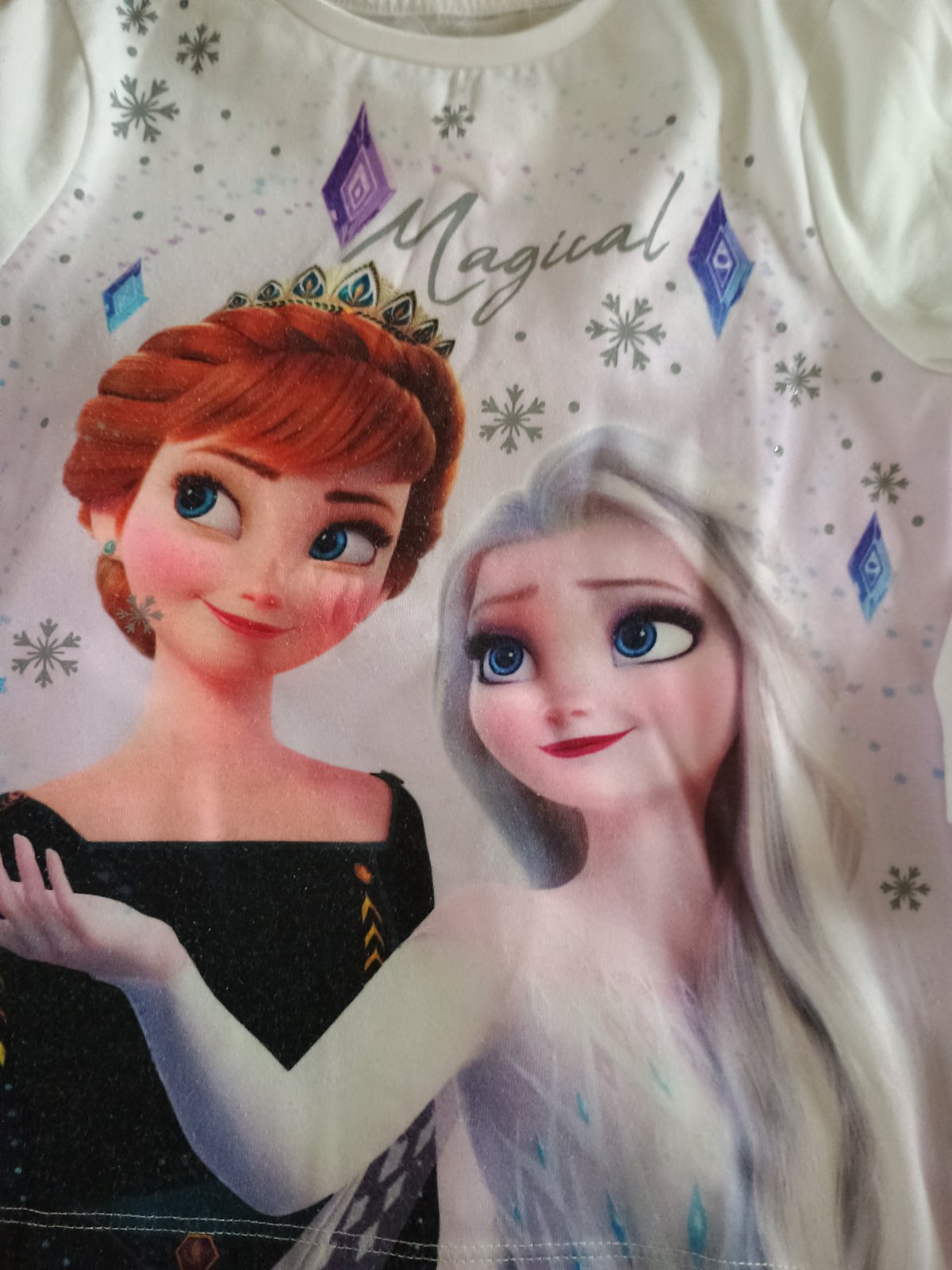 Tričko Frozen Elsa a Anna a biele tričko s Pannou s korálkami veľkosť 104 aj 110 sme ešte nosili. Potlač panda je už vidieť pouzivanie aj tričko Frozen zmolky. Cena spolu