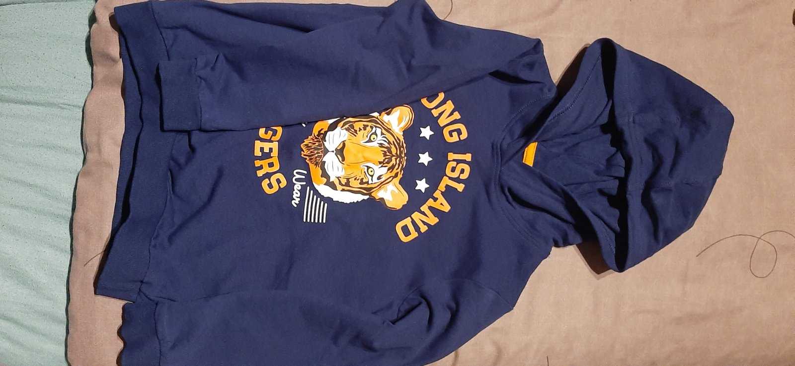 Krasne nenosene ( syn mi odmietal tricka s kapucnou) tricko s kapucnou s velkou nazehlovacou aplikaciou tigra a napisu Long Island Tigers.
