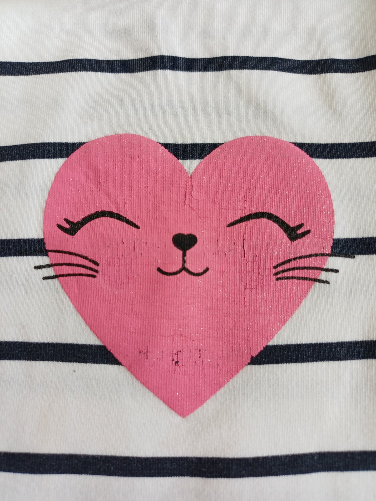 Predám tričko vo veľkosti 122/128. Veľmi dobrý stav bez fľav a bez dier, pogumované srdiečko má prasklinky (viď. foto)
