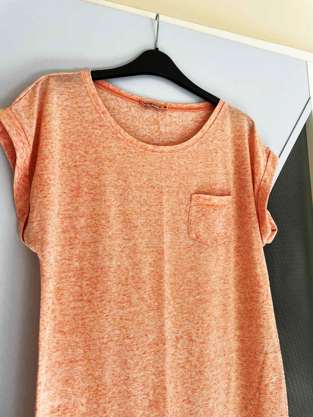 jemné tenké striekané tričko so spadnutými rukávmi a vreckom vpredu,šírka = 50 x 2 cm, dlžka = 69 cm,po celom jemnunké žmolky - nepatrné a voľným okom ich nie je vidieť