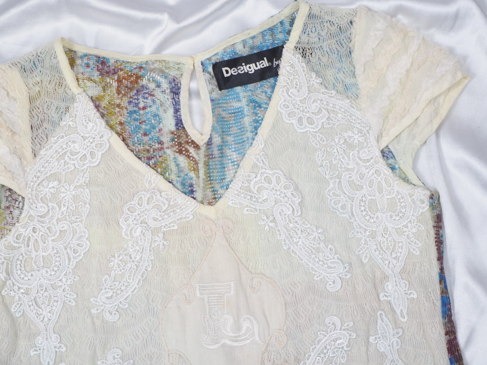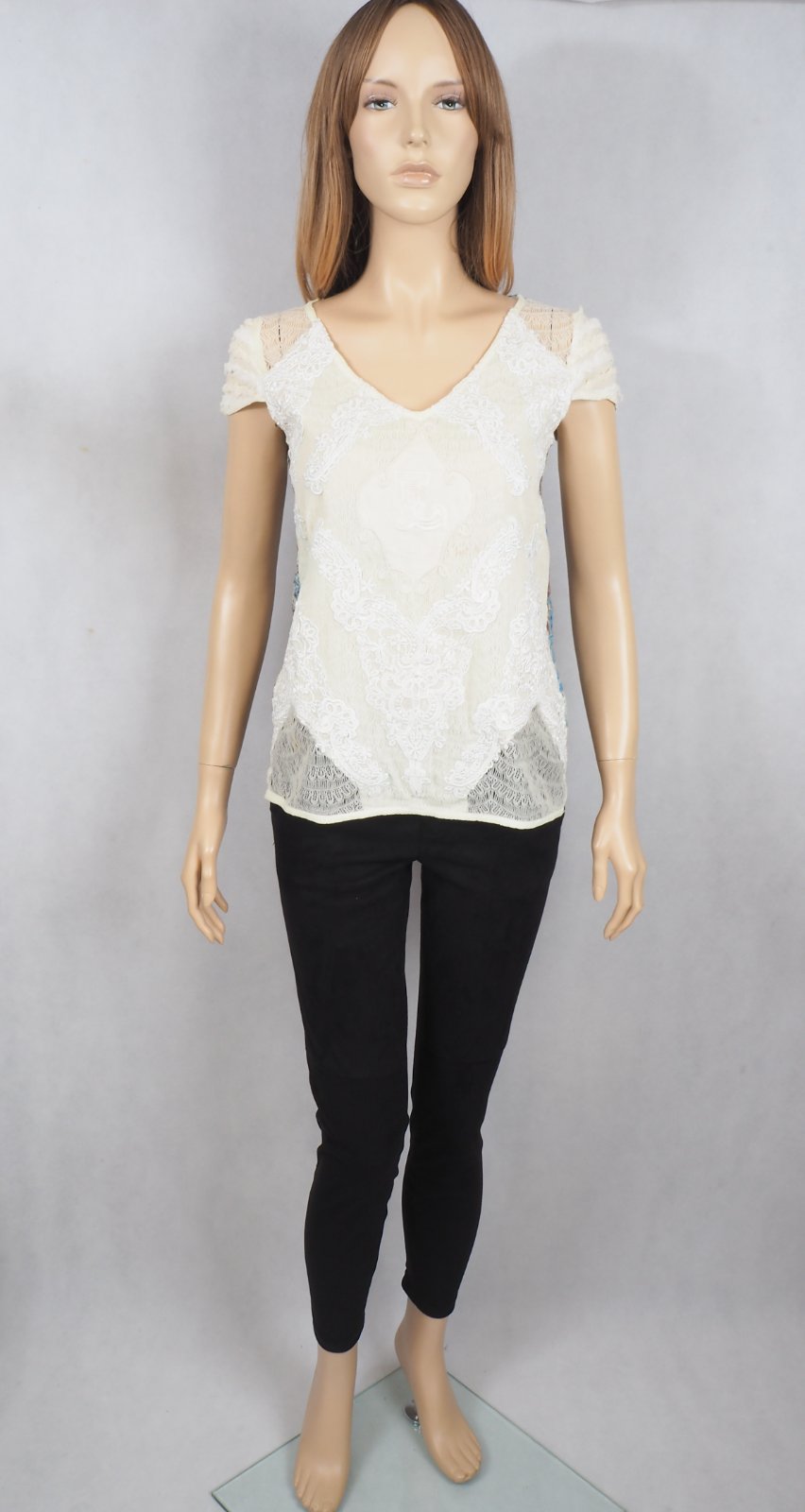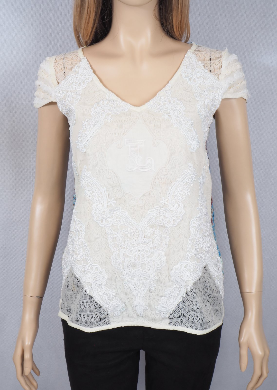 Kvalitný čipkovaný top, vpredu maslovej farby, vzadu vzorovaný, materiál 100% polyester, suepr stav.