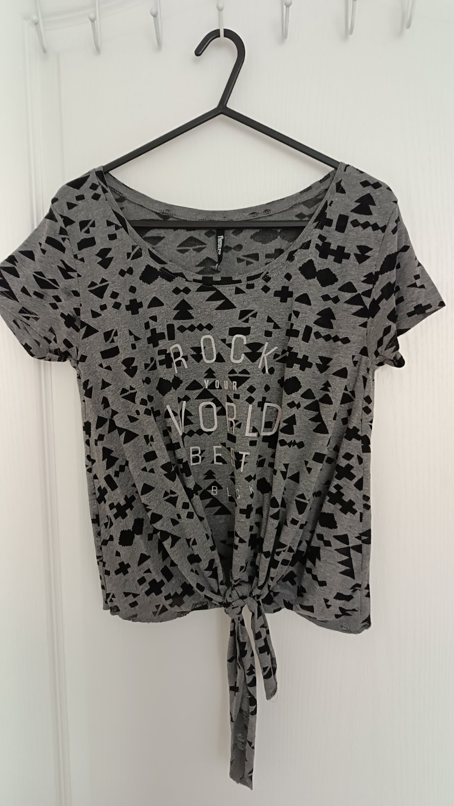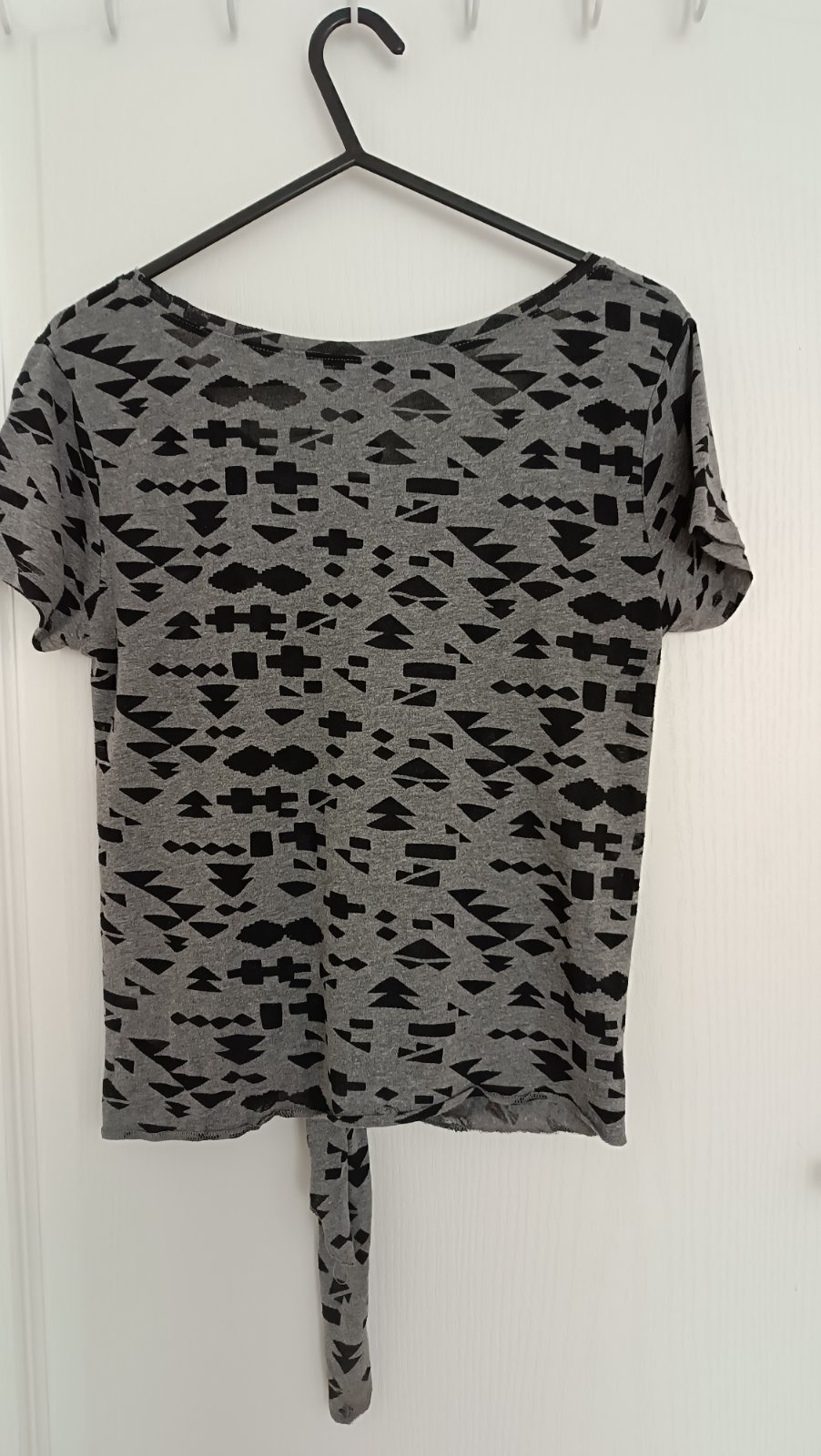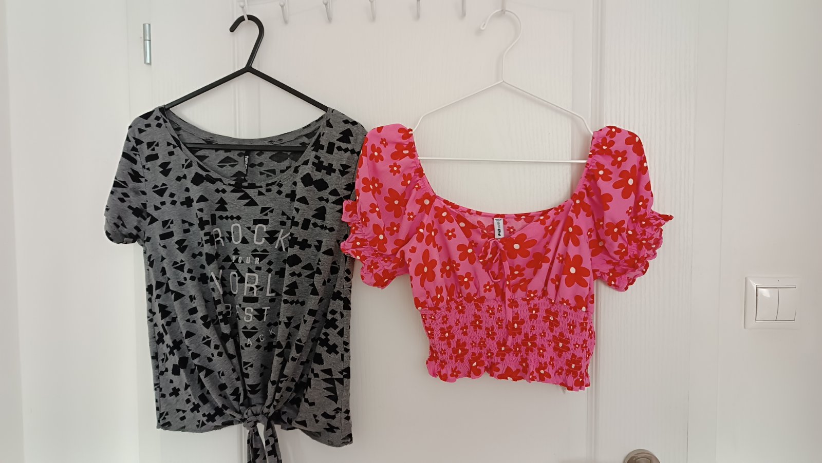 Sivo cierny značka Sinsay, Šírka 43cm, dĺžka 48cm, vpredu sa viaže, 60% bavlna, 40% polyester , bez poskodenia, tie čierne časti mierne presvitajú, ružový značka FB sisters Dĺžka 40cm, spodná časť šírka 28 cm, prsia cca 40cm, 100% viskóza, spodná časť sa dá natiahnuť, prispôsobí sa telu, cena spolu