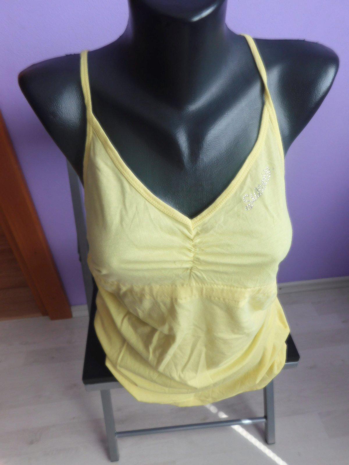 Dámske žlté tielko zn. Gate. Holý chrbát, na zaväzovanie okolo krku. Veľkosť M 38. Excelentný stav, iba raz použité.