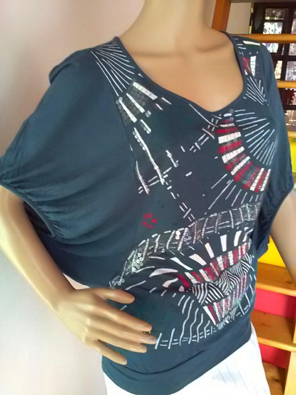 Petrolejovo zelený, s červenými a bielymi vzormi. Voľné balónové rukávy. 100% viskóza. V super stave.