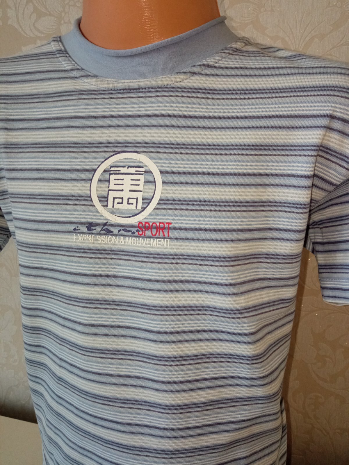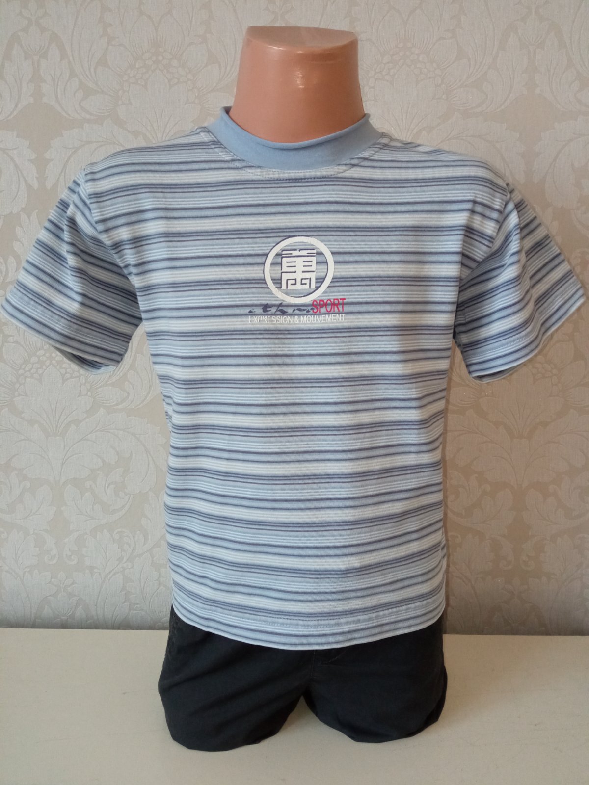 Chlapčenské pásikavé tričko s krátkym rukávom. Elastické. Veľkosť:114 (pre 6r.). Materiál 100%bavlna. Farba modro-biela.
