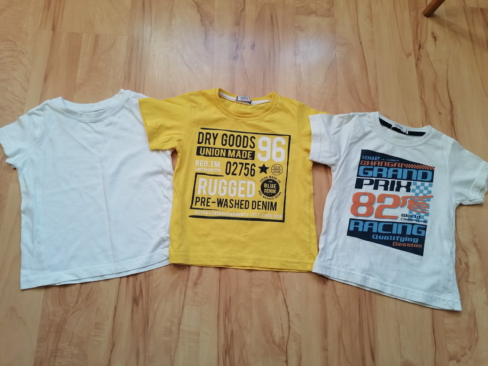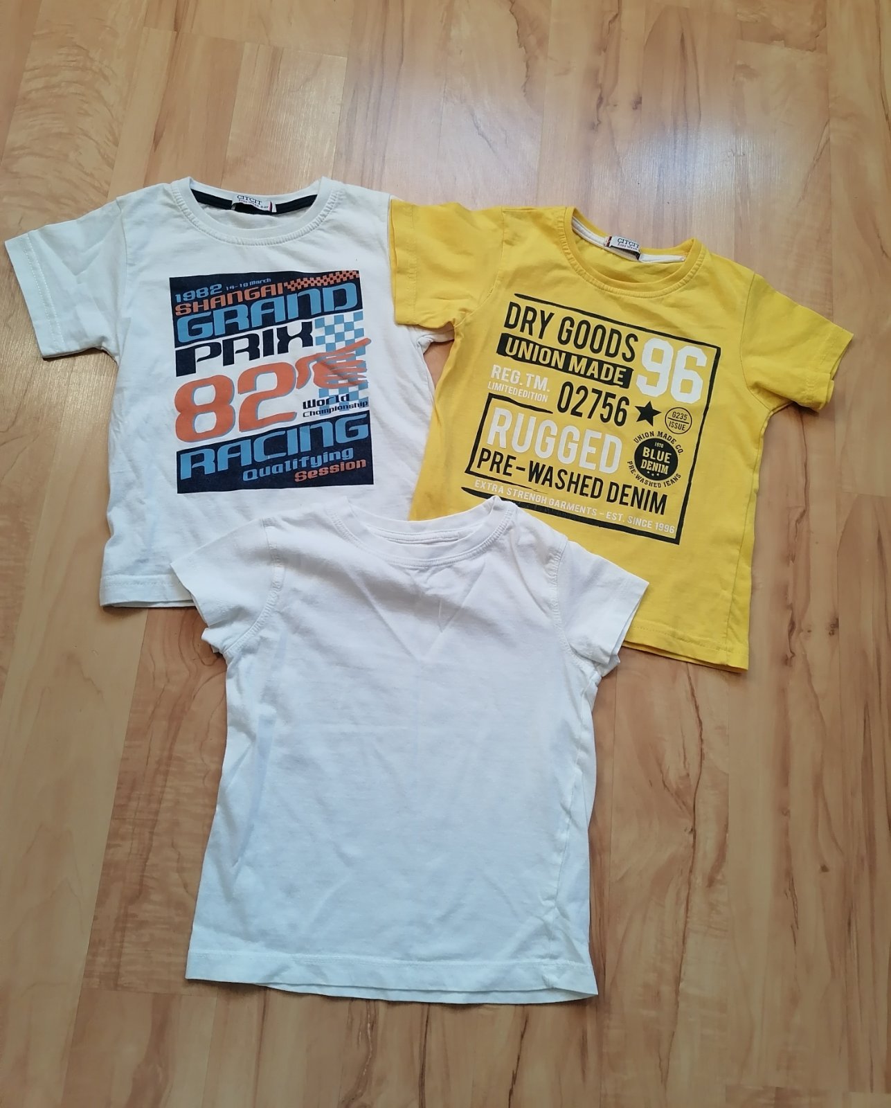 Pekný zachovalý stav. Jedno je 92 a 2x 98. Obidve biele majú malú šmuhu, jedno vpredu a druhe vzadu. A zlte treba prišiť dierku kolo rukáva. Inak v peknom stave, vhodné aj do škôlky. Akurát tie male nedostatky... Inak sú ako nové, 1-2x oblečené.