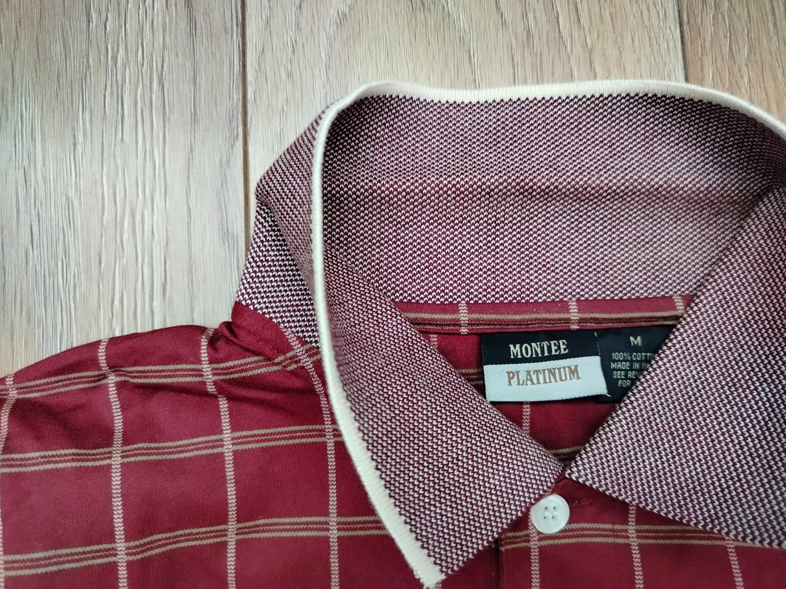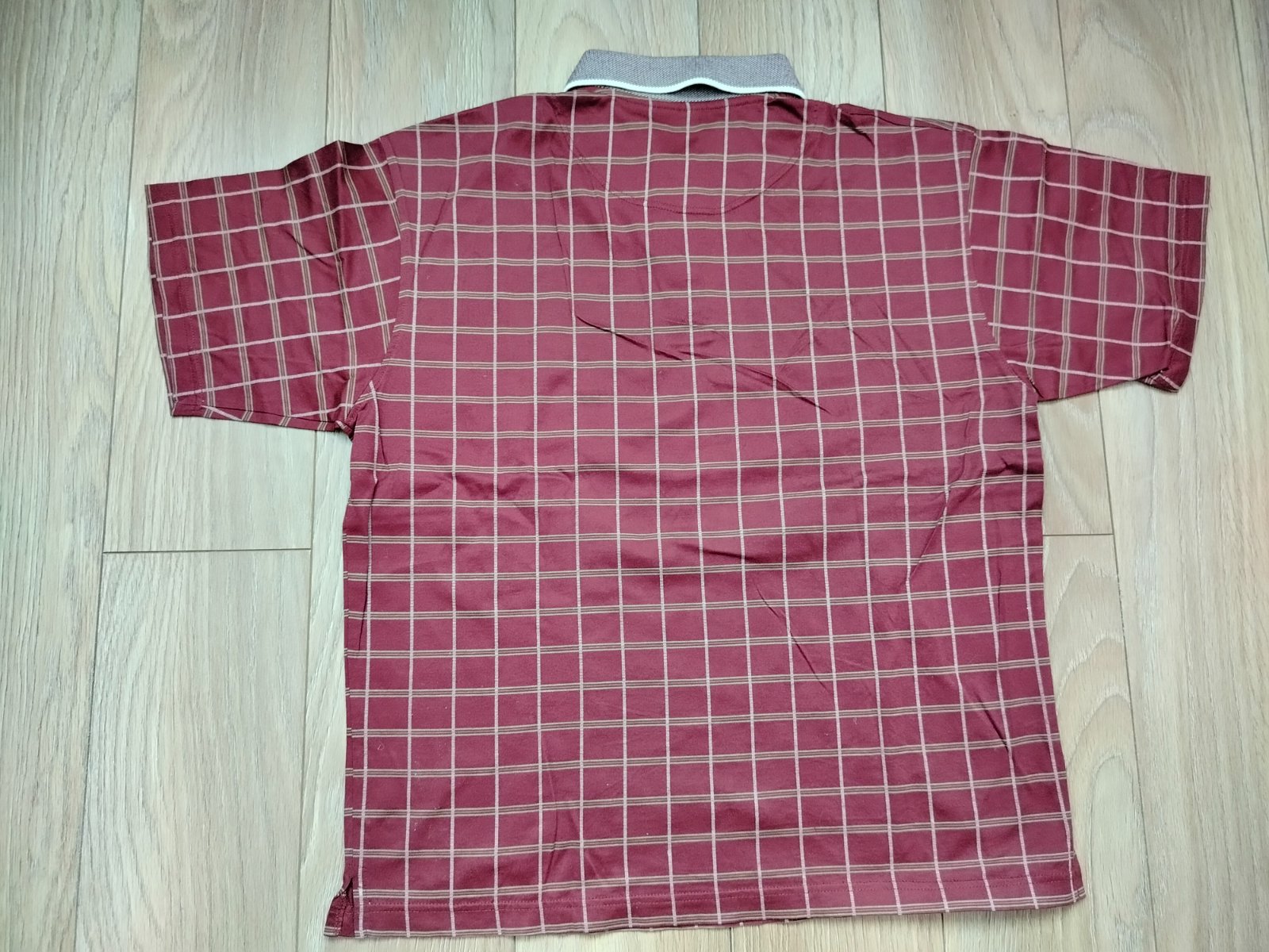 Farba: bordová / vínová s jemnou béžovo-krémovou mriežkou (grid / kocka vzor), decentný a elegantný vzhľad – hodí sa na bežné nosenie, do práce smart casual, golf, víkend aj na dovolenku.