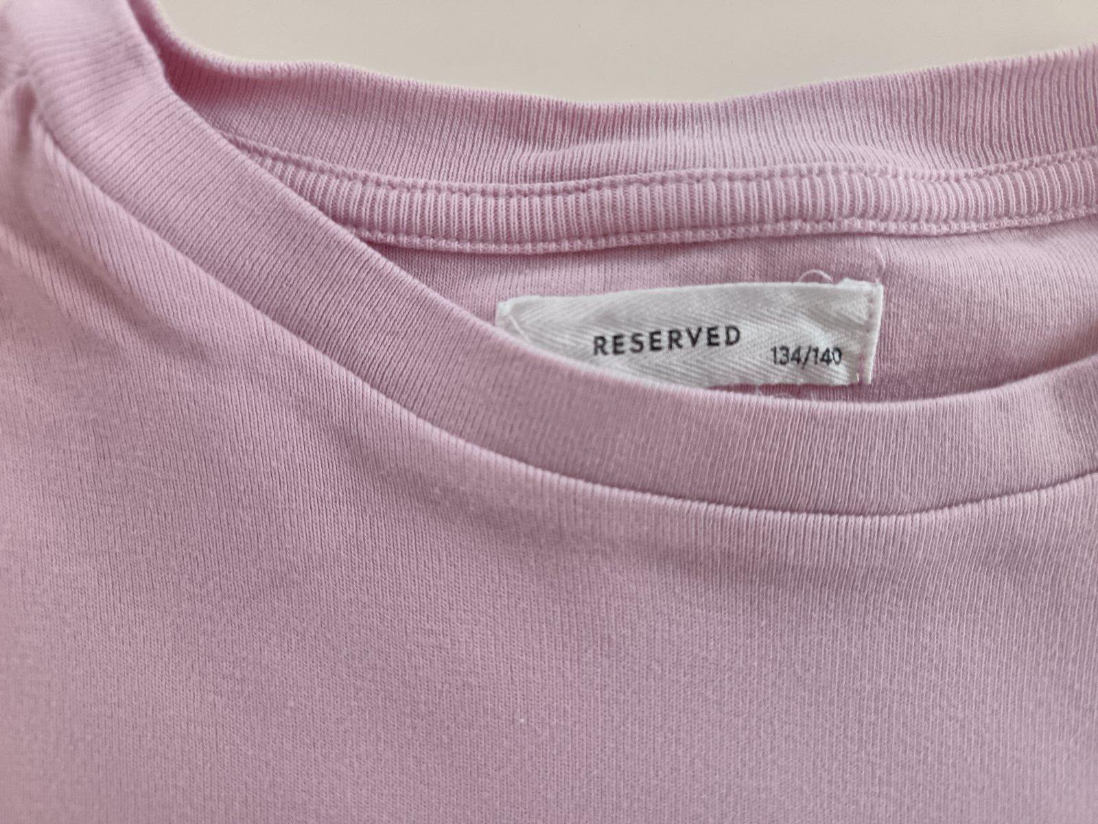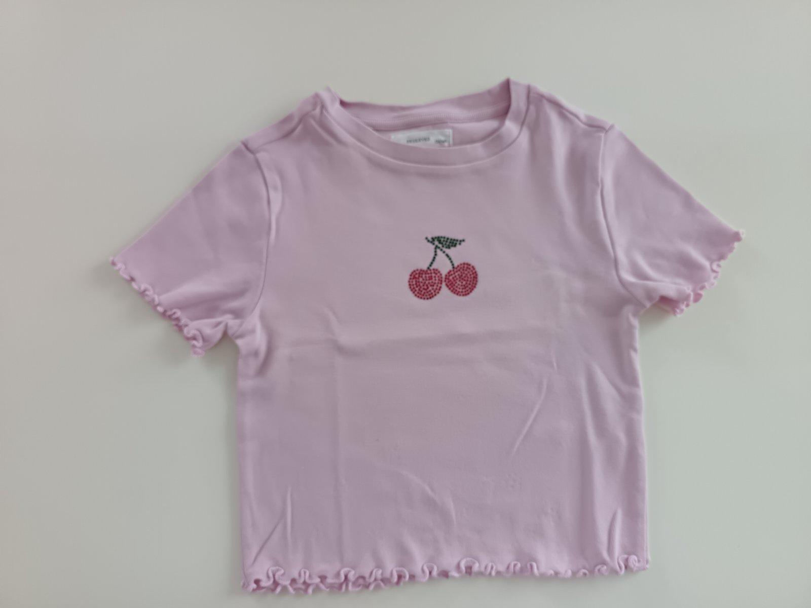 Tričko bledo ružovej farby a čerešňami, ktoré sú vykamienkovane, bez poškodenia