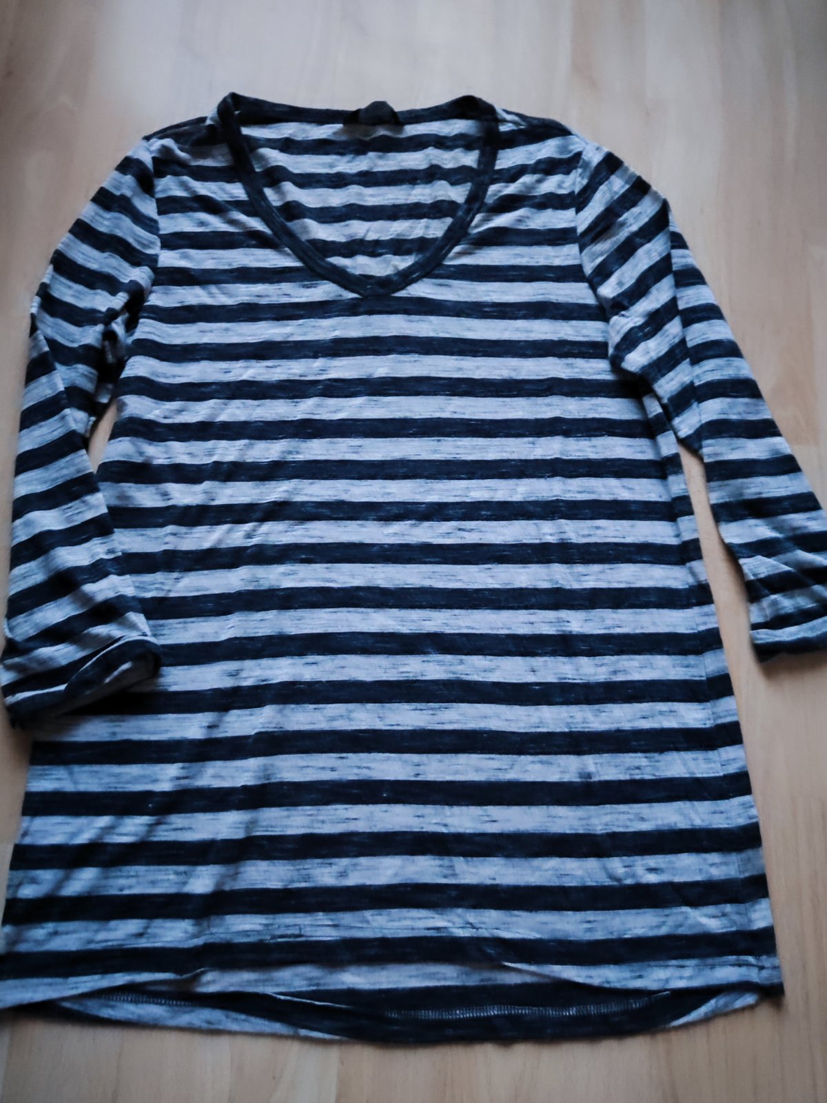 Predám dámske tričká vel. M-L 1 ks dlhý rukáv+3 ks 3/4 rukáv (dĺžka 65-67 cm, šírka od 49-50-51 cm, prispôsobia sa na postave , farby bielo-čierny pásik, bielo-tmavomodrý pásik, sivo-modro-zelený p...