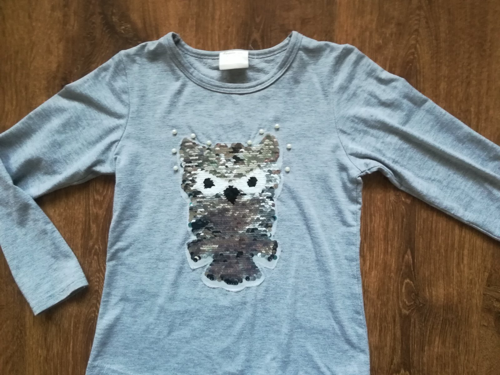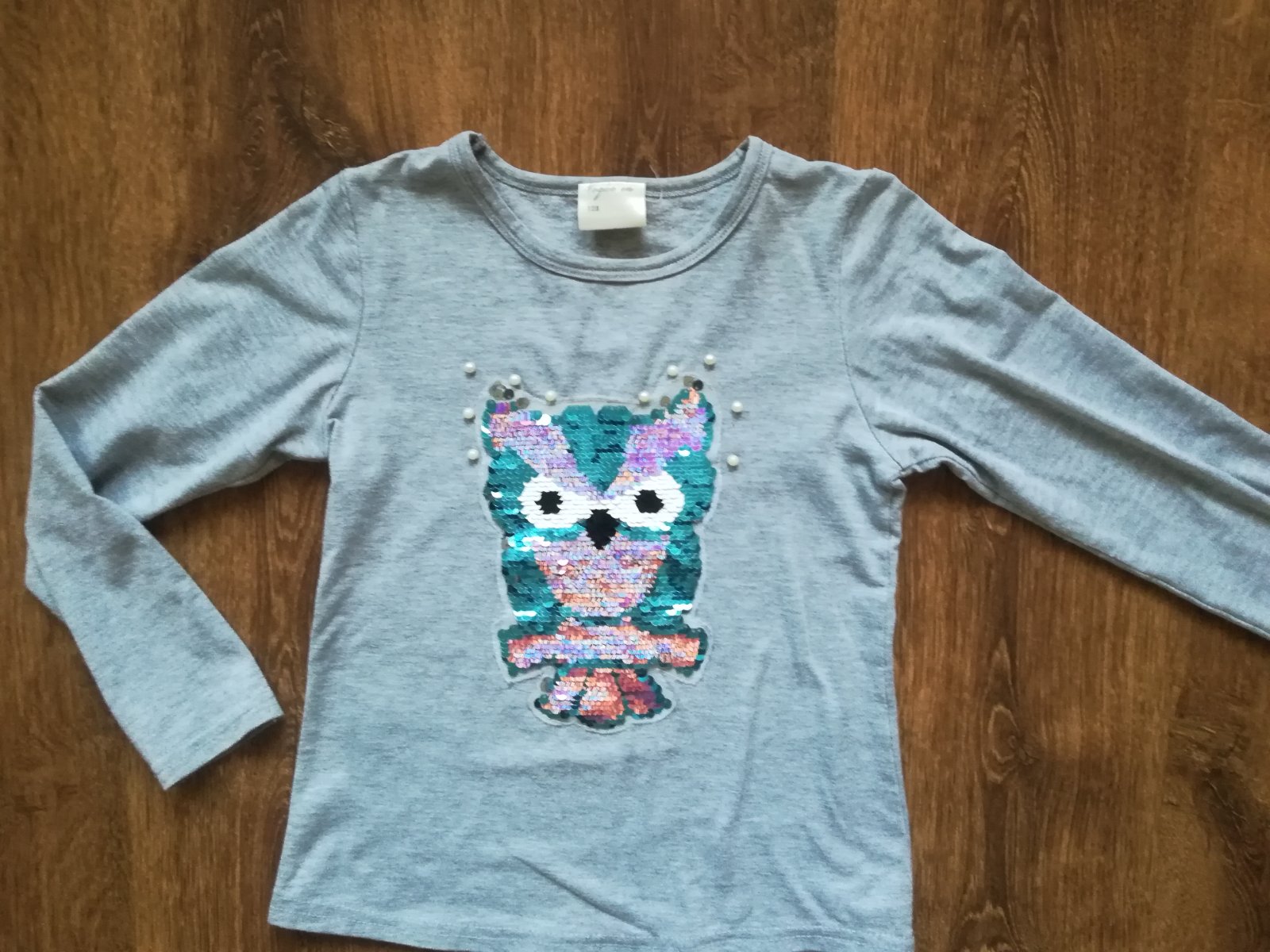 Veľmi pekne meniace tričko. Vid foto. Jedna strana je sivá, druhá farebná. Velkosť je uvedená 128, ale povedala by som ze skôr 122.