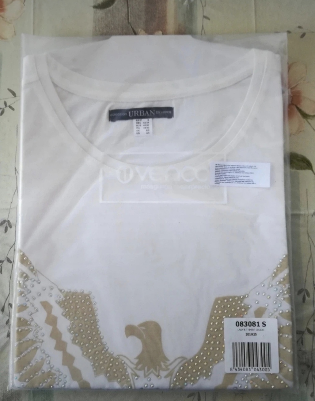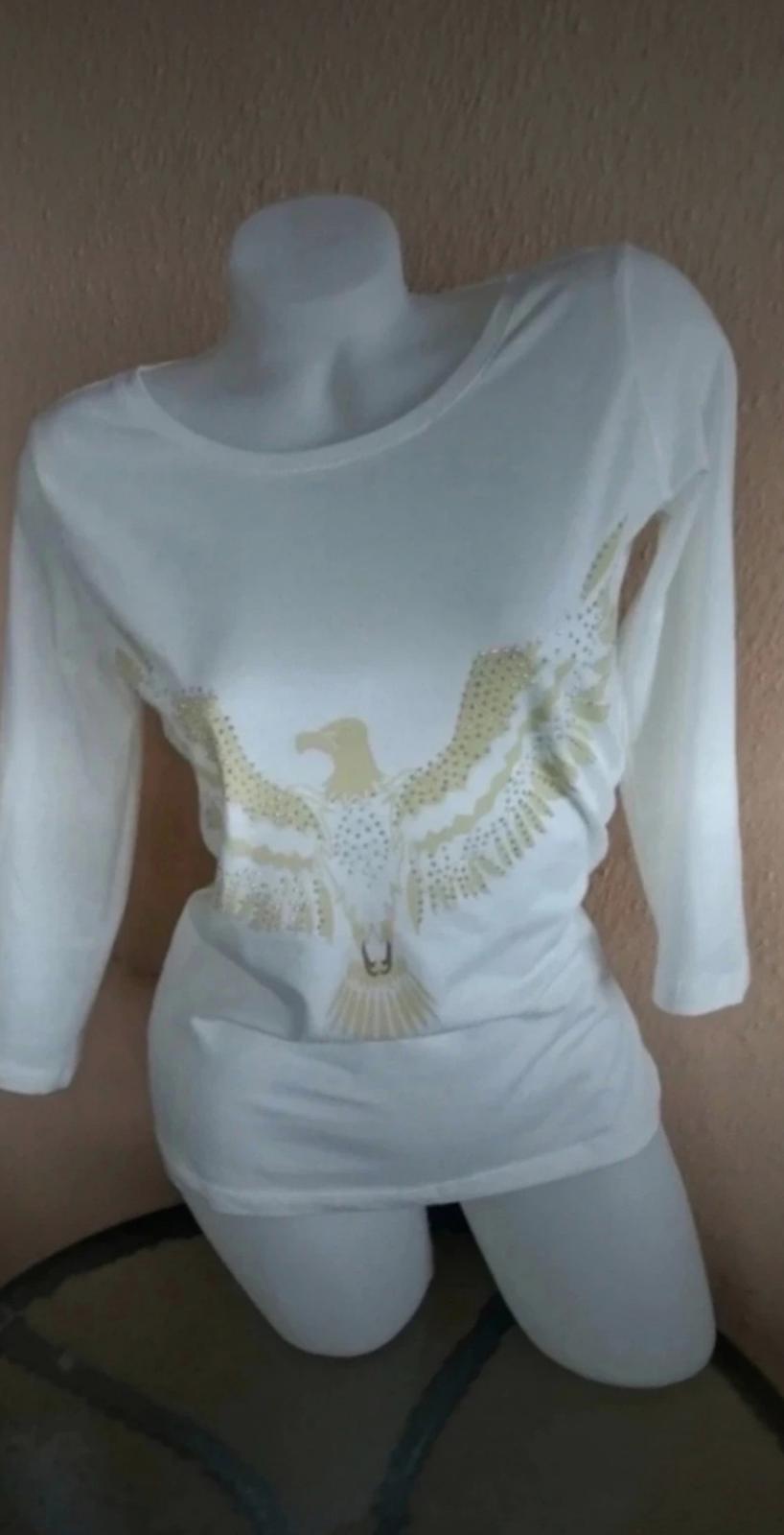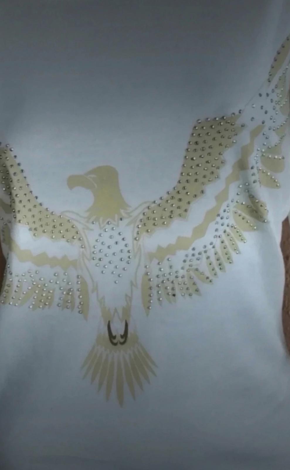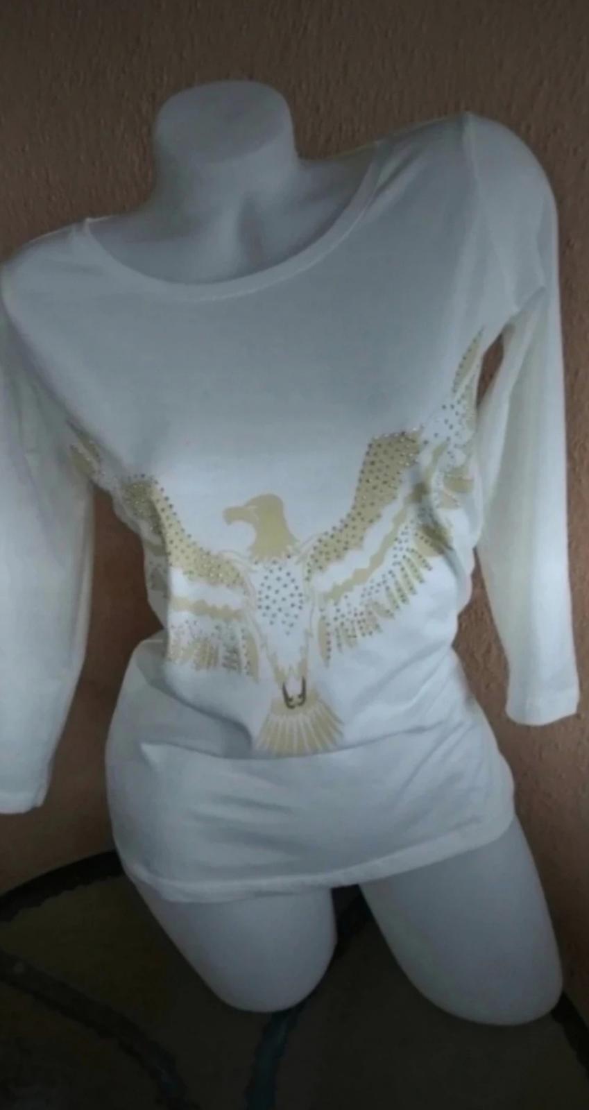 Nové, nenosené, elegantné bavlnené tričko/ top v nádhernej maslovo bielej farbe s trblietavými kamienkami a potlačou orla, s trištvrťovými rukávmi.