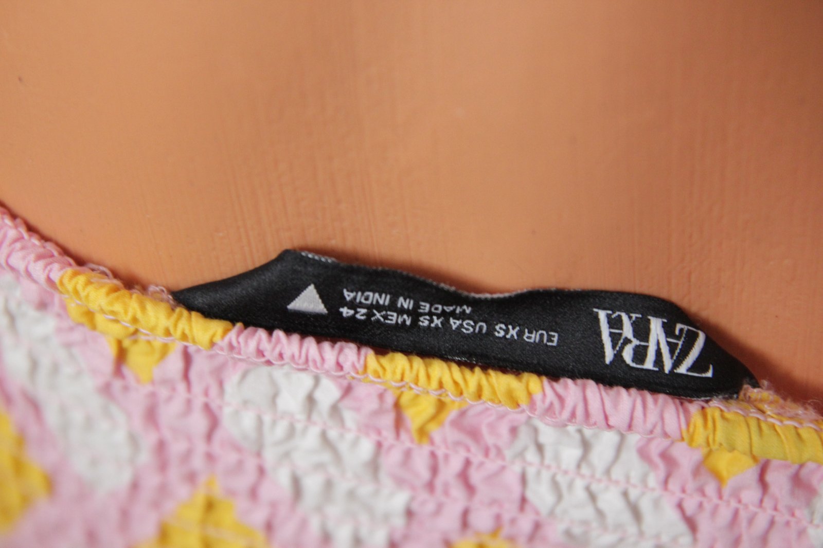 Ružovo bielo žltý body top, značka Zara, veľkosť XS, na boku sa zapína. Na chrbte je elastický. Rukávy sú nafúknuté - puff.