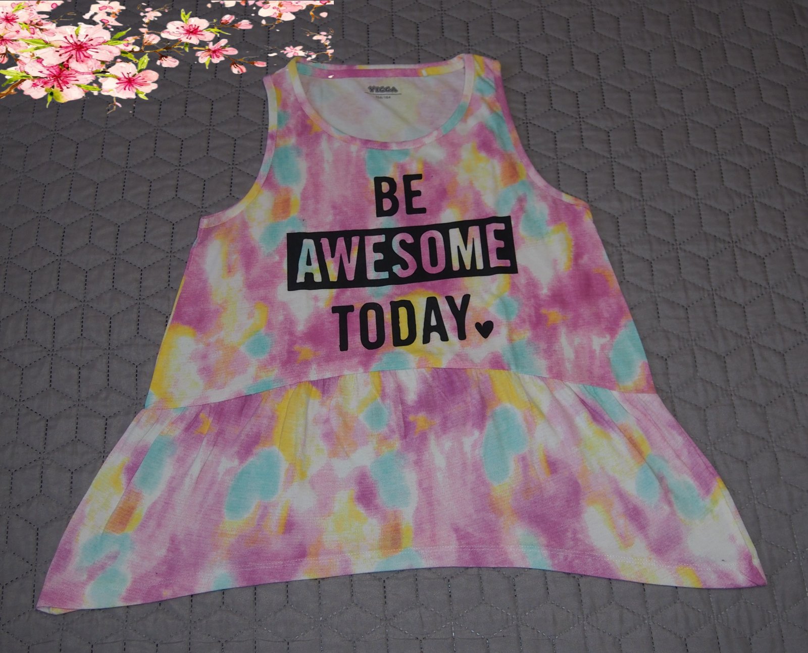 Predám dievčenské tričko veľkosť 158/164 s čipkou na spodnom leme hrudník 2 x 43 cm pás 2 x 41 cm boky 2 x 44 cm dĺžka 57 cm rukáv od krku 65 cm