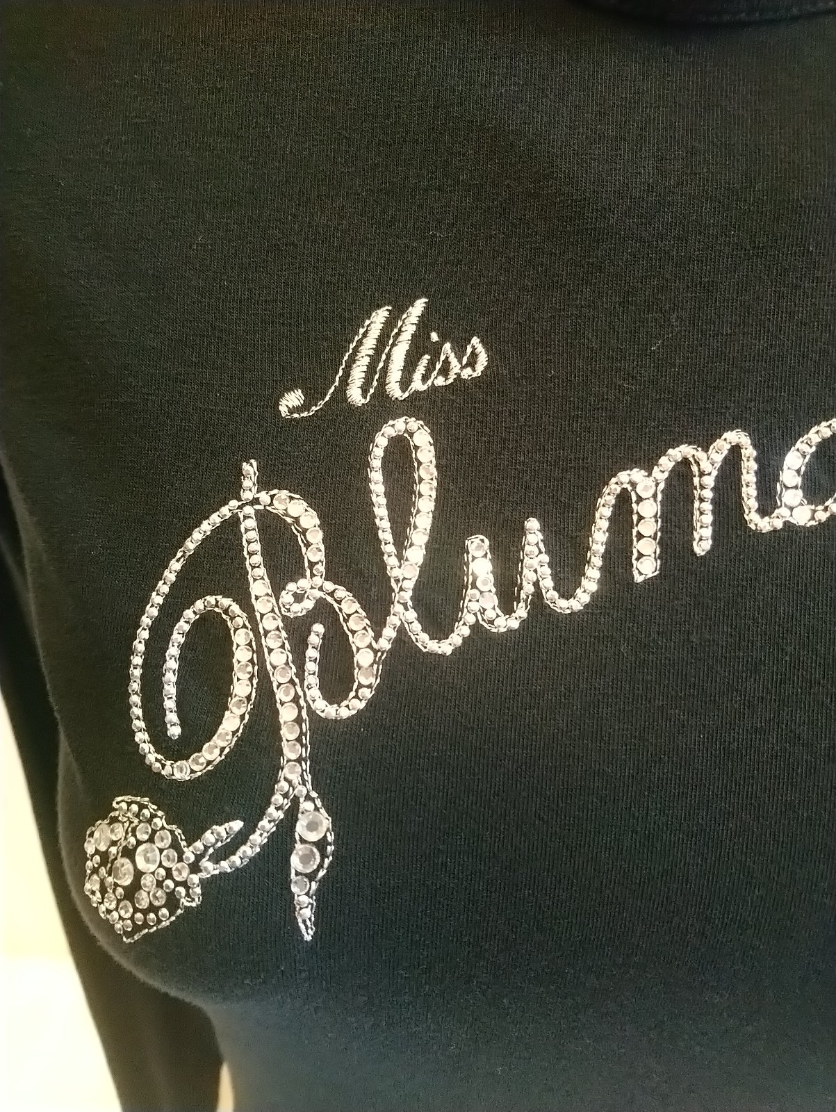 dámsky čierny elastický top s nápisom z kamienkov,