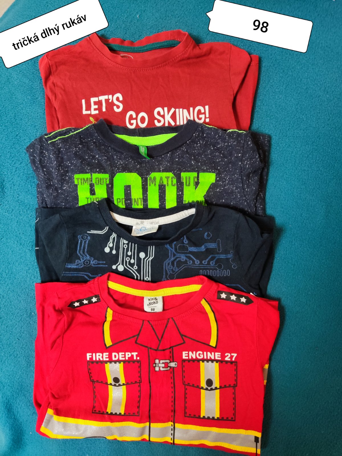 Predam 4 dlhe tricka, vsetky 98 - 2x F&F, C&A. Horne cervene ma na brusku fliacik, vianocne ma znamky nosenia bez poskodenia. Ostatne bezchybny stav. Cena spolu 3€. Osobne v BA alebo postou.