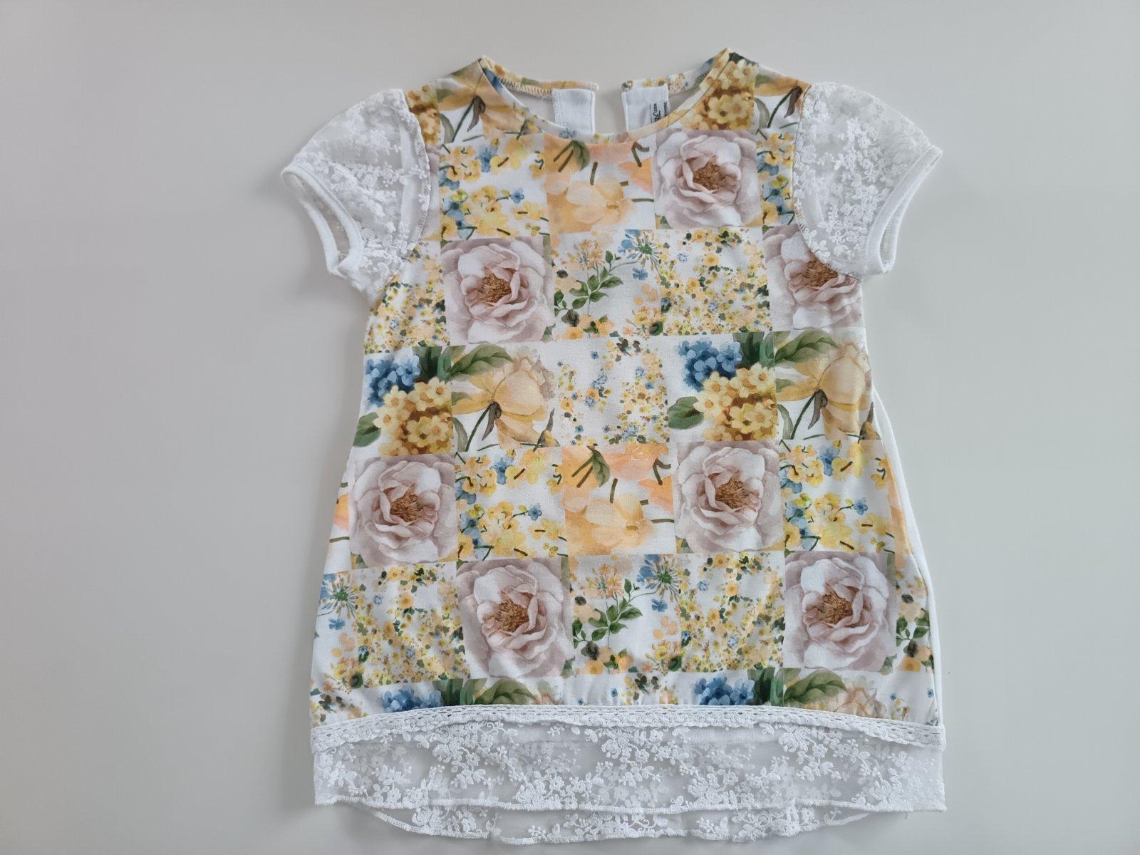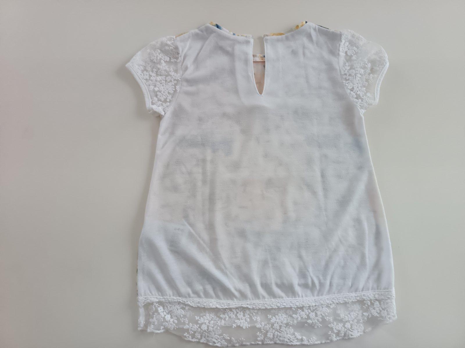Biele tričko so žltou kvietkovanou potlačou, na rukávoch a zo spodu krajka, zapínanie zo zadu na gombík, bez poškodenia