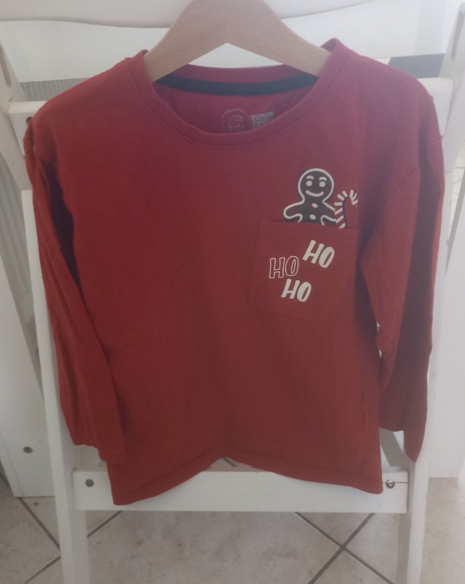 Ponukam červené tricko s obrazkom. Oblecene len raz na Mikulasa . dlzka predneho dielu 50 cm rukav od krku 54,6 cm