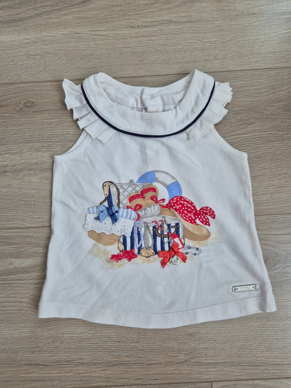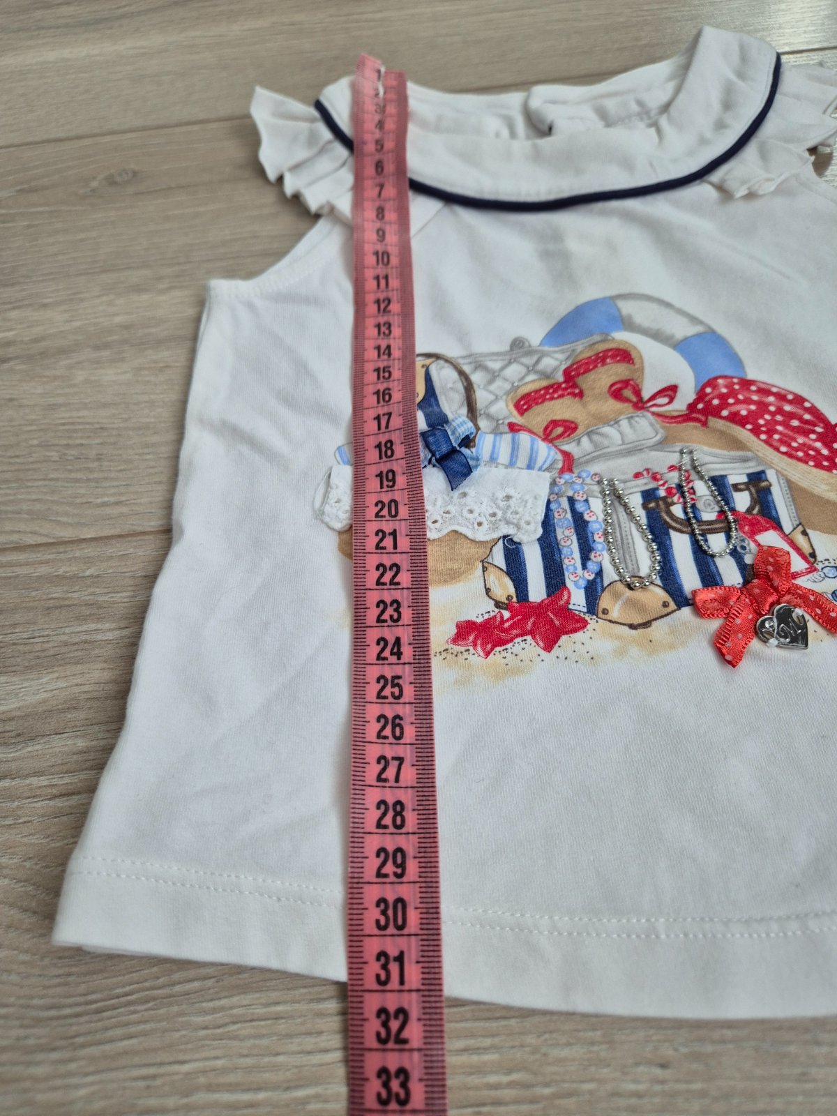 Biele tričko s motívom troch dievčatiek, s volánikom na pleciach, veľkosť 86. Top stav.