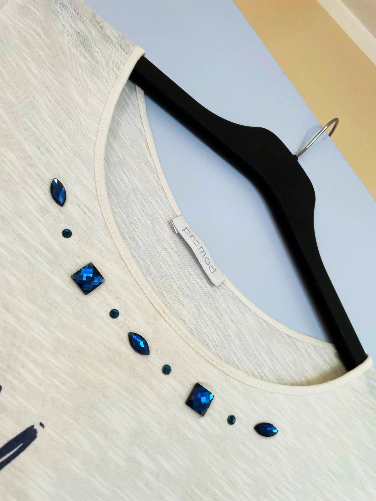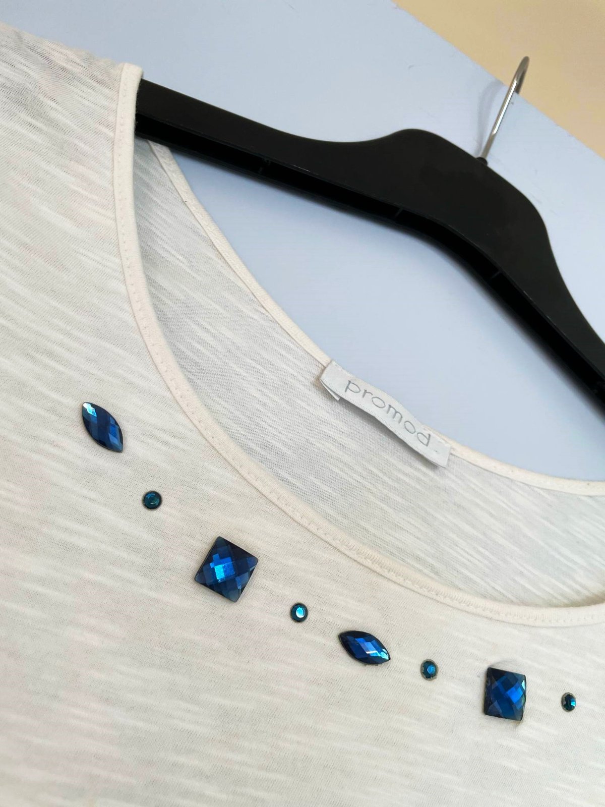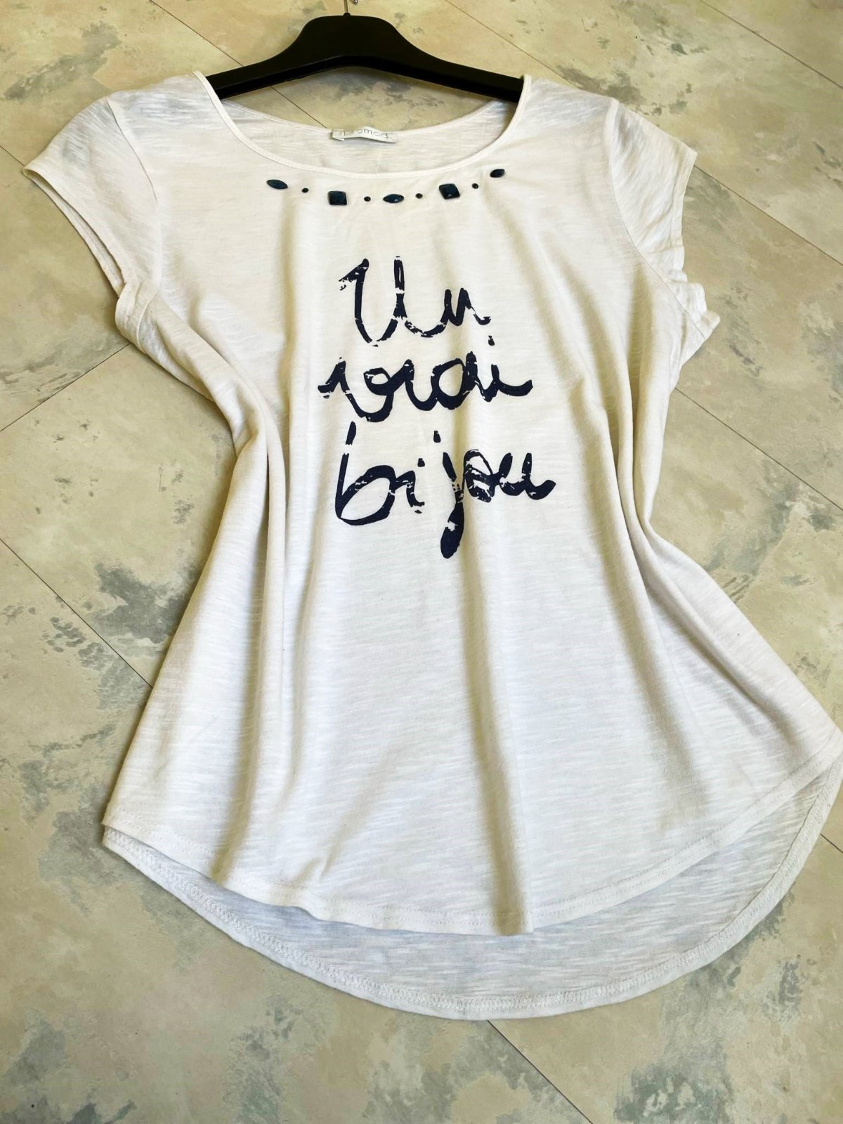 kvalitné,min.nosené zaujímavé značkové tričko pre milovníkov bielych kvalitných tričiek,krásna štruktúra materiálu,100% bavlna,vpredu tmavomodré kamienky,top stav a kvalita,tmavomodrý nápis