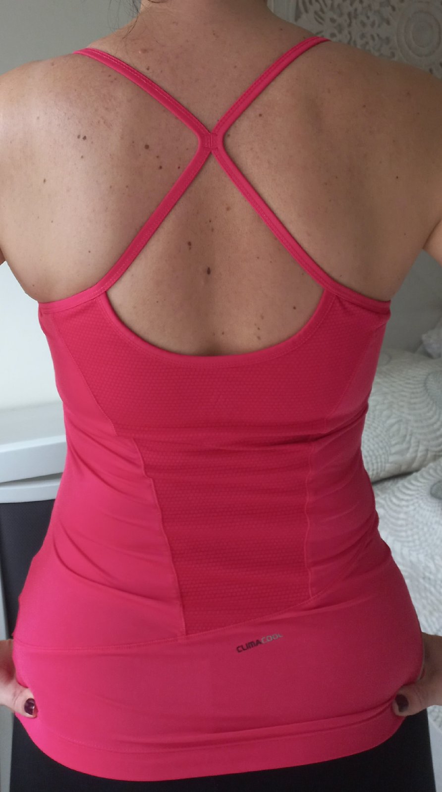 Všitá podprsenka, so širokou gumou po obvode. Veľkosť písaná na L, ale kľudne aj na M. Foto je na výške postavy 180cm s konfekciou M-L