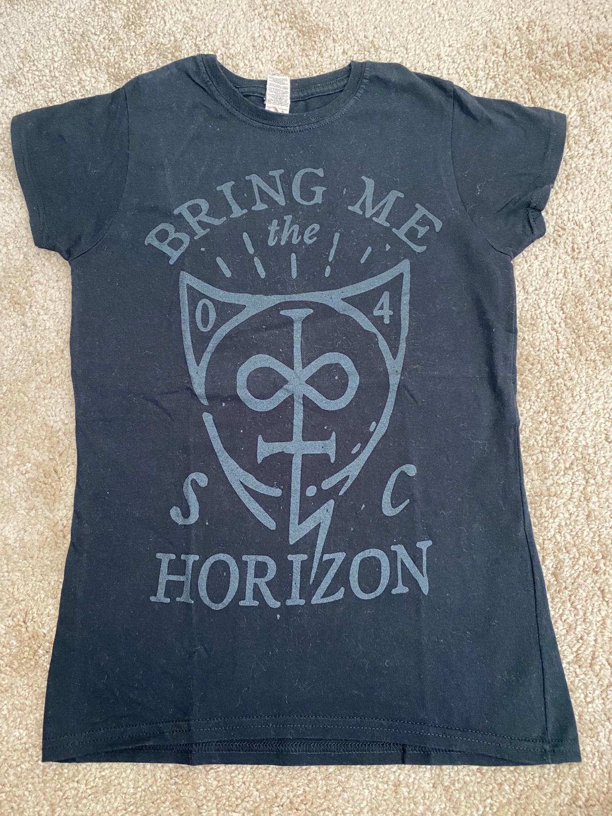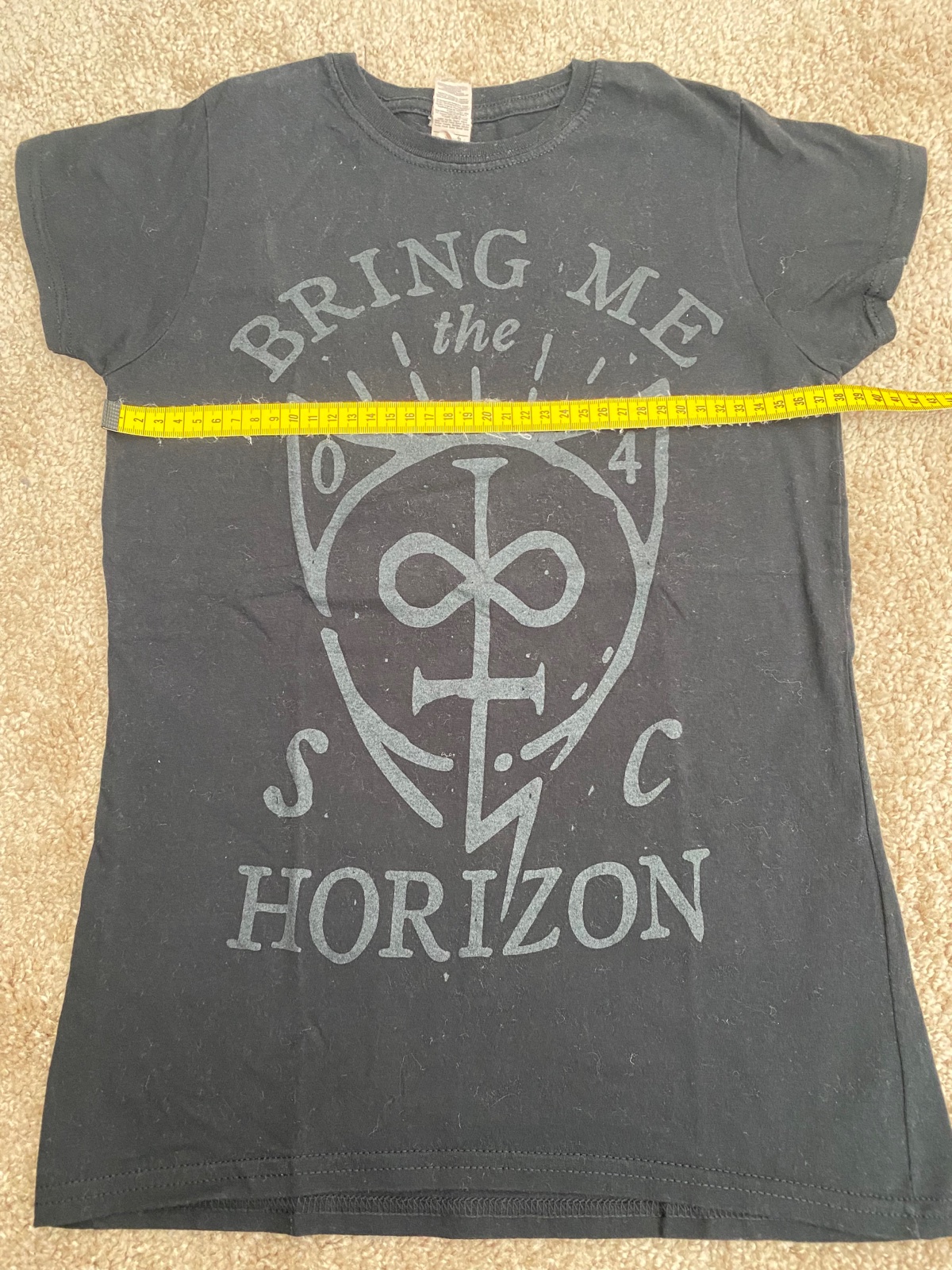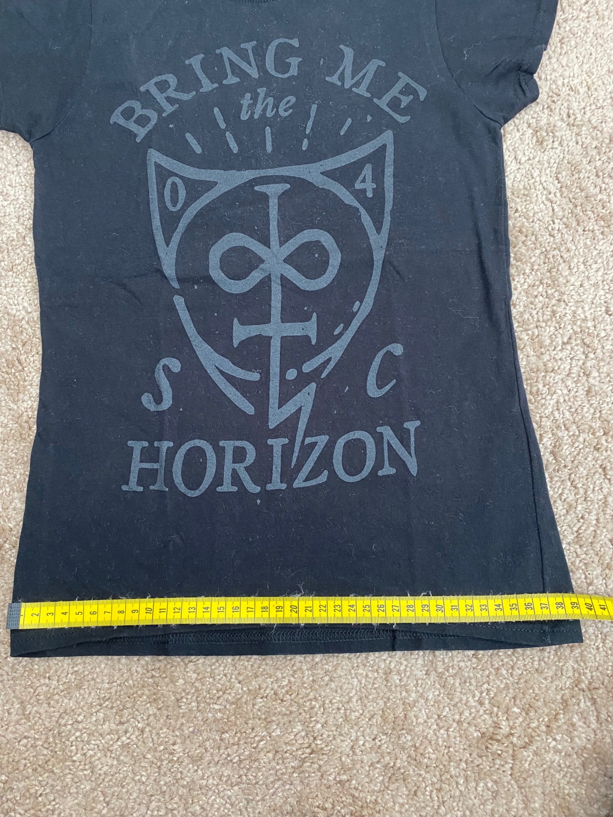 Tričko, merch skupiny Bring me the horizon, nosené ale v dobrom stave, bez poškodení. Veľkosť S, rozmery na foto. Cena 3€ + poštovné