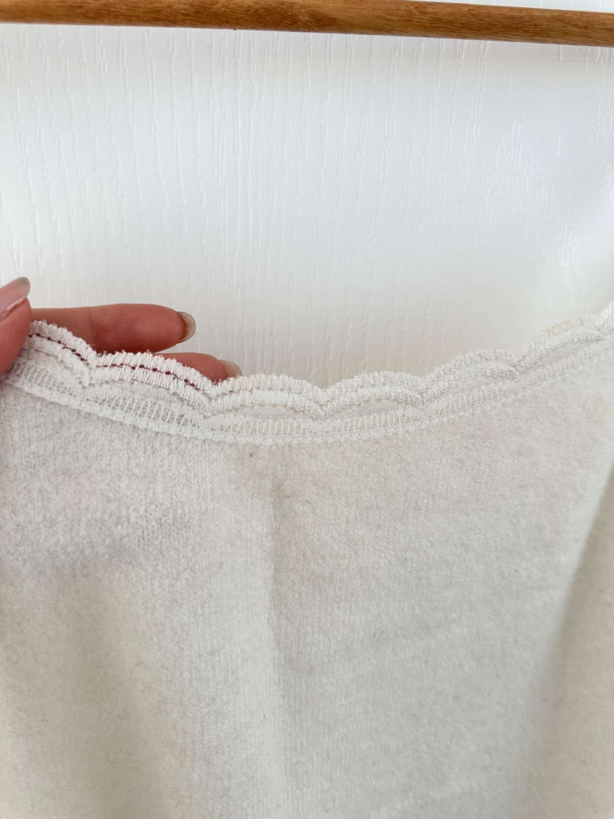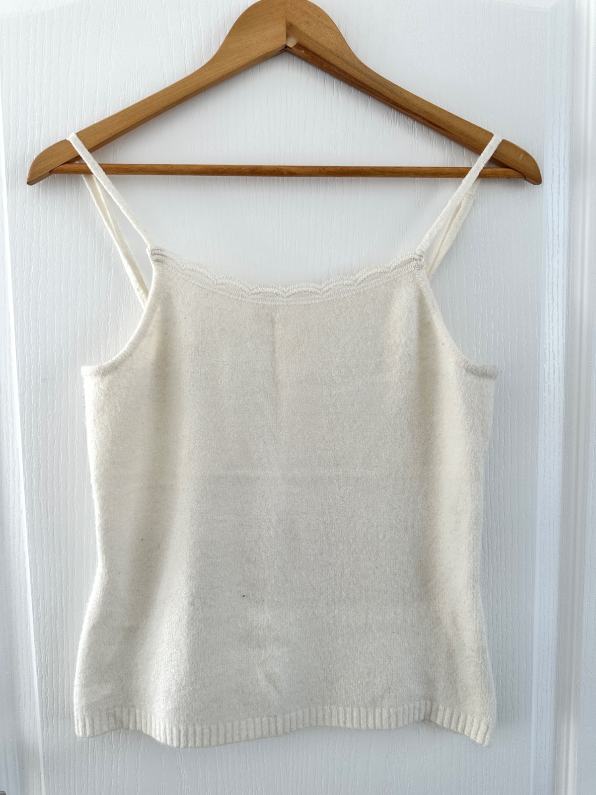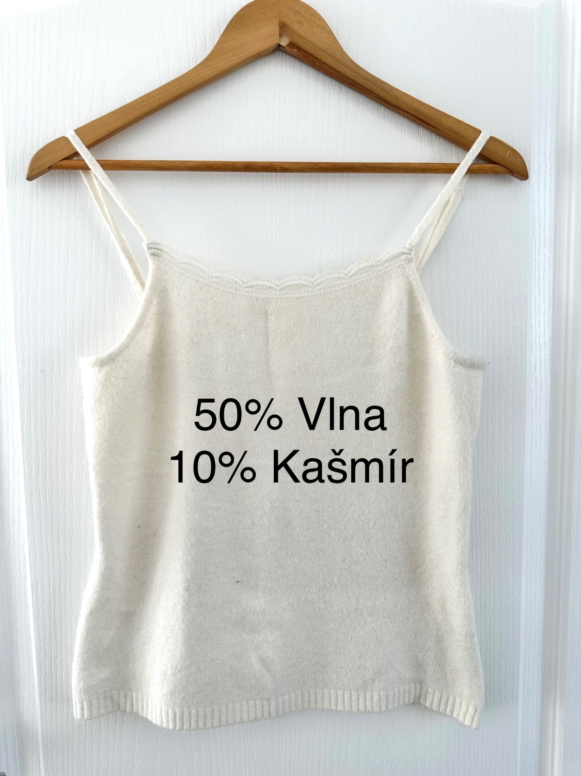 Nádherný úpletový top vo farbe lomenej bielej (ecru/ivory). Je to výnimočný kúsok šatníka, ktorý vďaka svojmu vysokokvalitnému zloženiu spája eleganciu s mimoriadnym komfortom pri nosení. Materiál tvorí veľmi ušľachtilá zmes 50 % vlny (wool) a 10 % kašmíru, vďaka čomu je top neuveriteľne mäkký, „nehryzie“ a napriek svojej ľahkej forme poskytuje teplo. Prímes akrylu a elastanu zabraňuje deformácii materiálu. Výstrih je lemovaný subtílnou, ženskou čipkou, ktorá mu dodáva jemnosť. Tenké „špagetové“ ramienka sú dĺžkovo nastaviteľné, čo umožňuje dokonalé prispôsobenie hĺbky výstrihu. Klasický, priliehavý strih s dôrazom na detailné vypracovanie (rebrovaný lem v spodnej časti). Top je mimoriadne univerzálny. Skvele sa hodí: