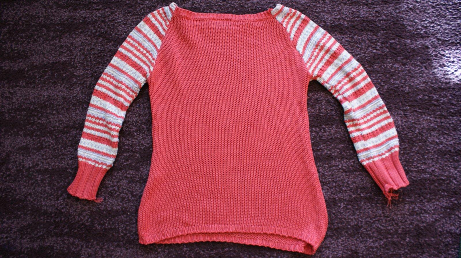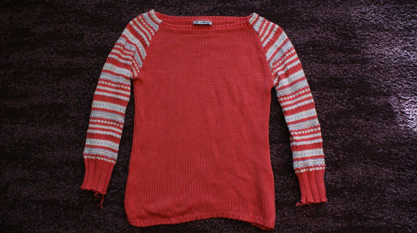 Ponukam krasny pleteny svetrik peknej sytoruzovej farby a pasikave rukavy - tie sa na koncoch trochu strapkaju..Inak je vo velmi peknom stave. Velkostne sedi na S/M. Postovne podla tarif alebo osobny odber.