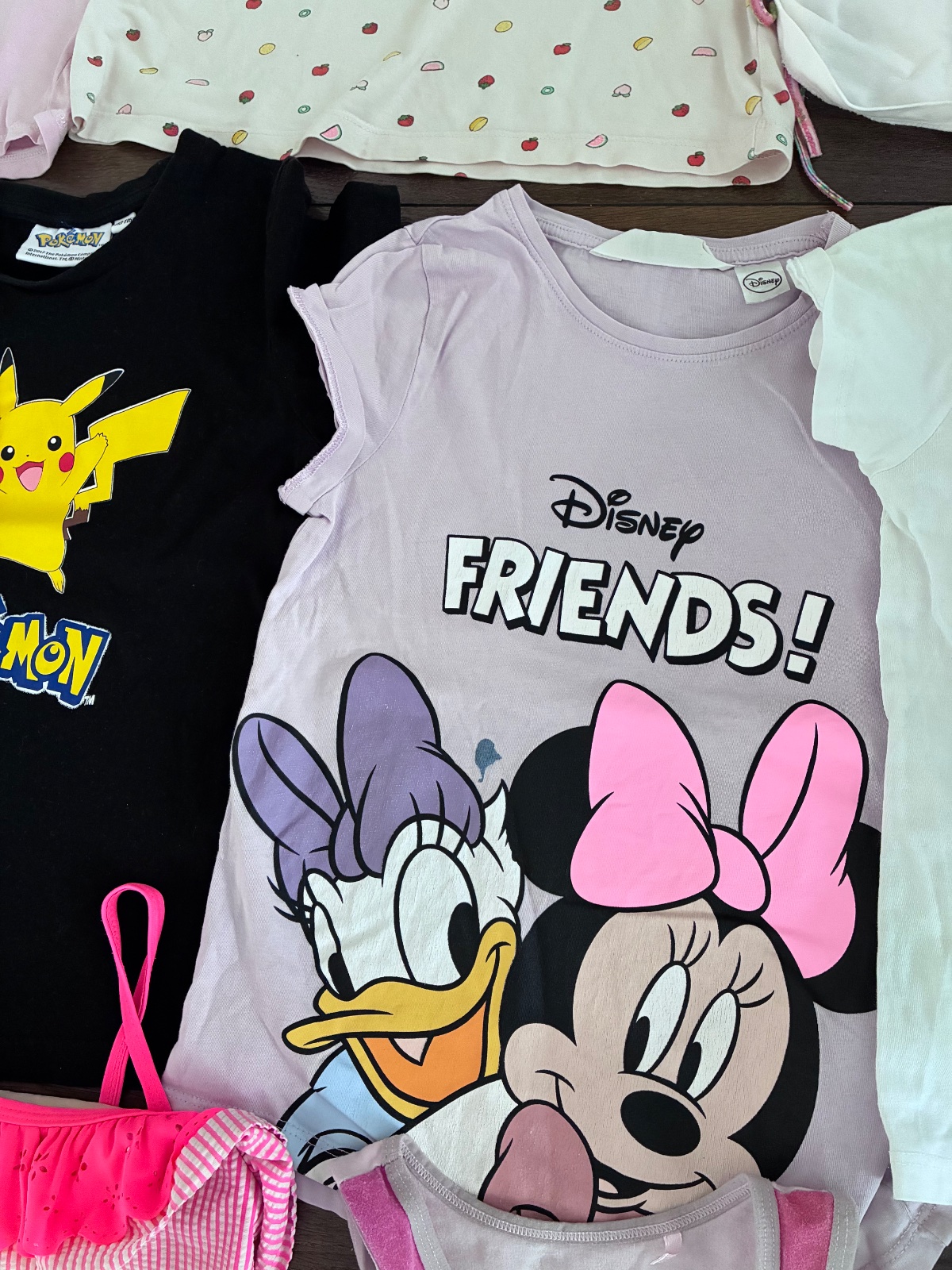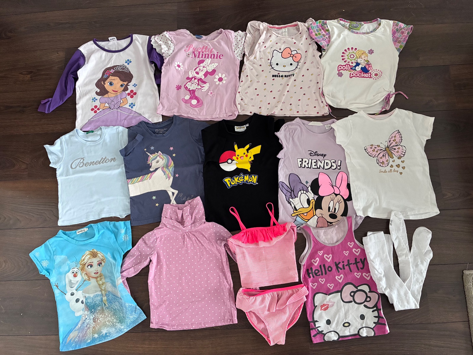Tricka, prevazne kratky rukav, 1 ks poncosky, tielko a plavky. Vsetko pekny stav, na jednom tricku fliacik (vid. foto).