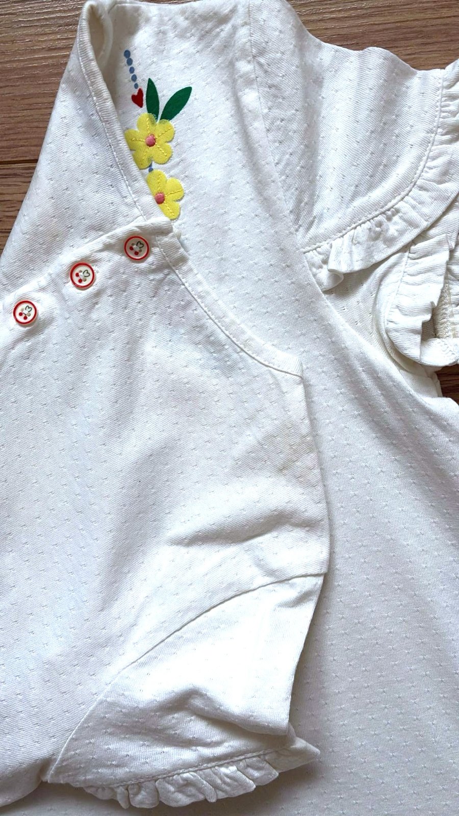 Predám biele tričko s ovocným motívom (čerešne, jahody, citróny), vyšitá aplikácia je v tvare náhrdelníka, má zaujímavú jemnú štruktúru z tenšej bavlnenej látky, vzadu praktické zapínanie na 3 gombíky, d=50cm, š=37cm, stav veĺmi dobrý.